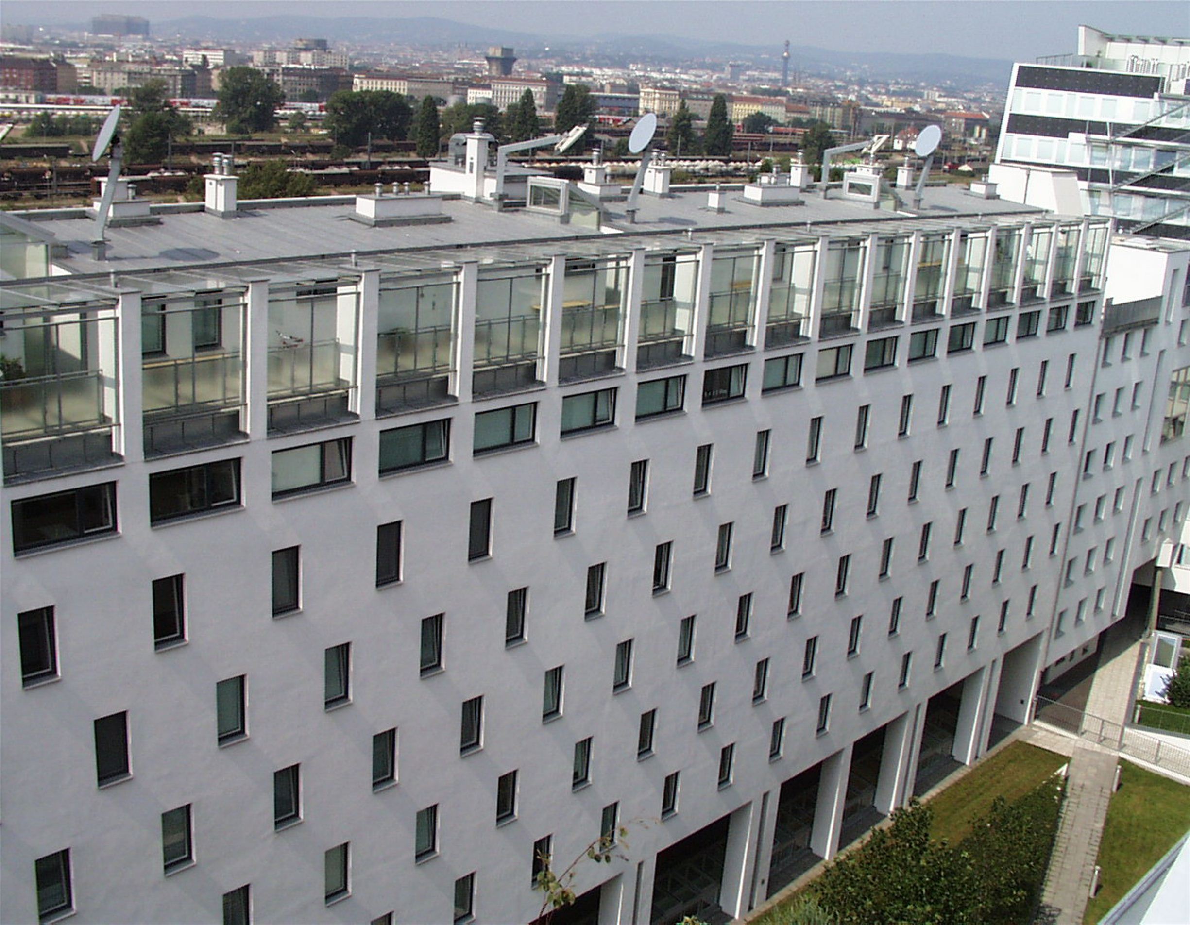 Wohnen in Wien LeopoldstadtDie Wohnhausanlage gliedert sich in einem ab dem Erdgeschoß aufgeständerten Straßentrakt und zwei Hofgebäuden. Durch die Aufständerung bleibt der Blick zur Vorgartenstraße frei, der Gartenhof wird dadurch großzügig erweitert.