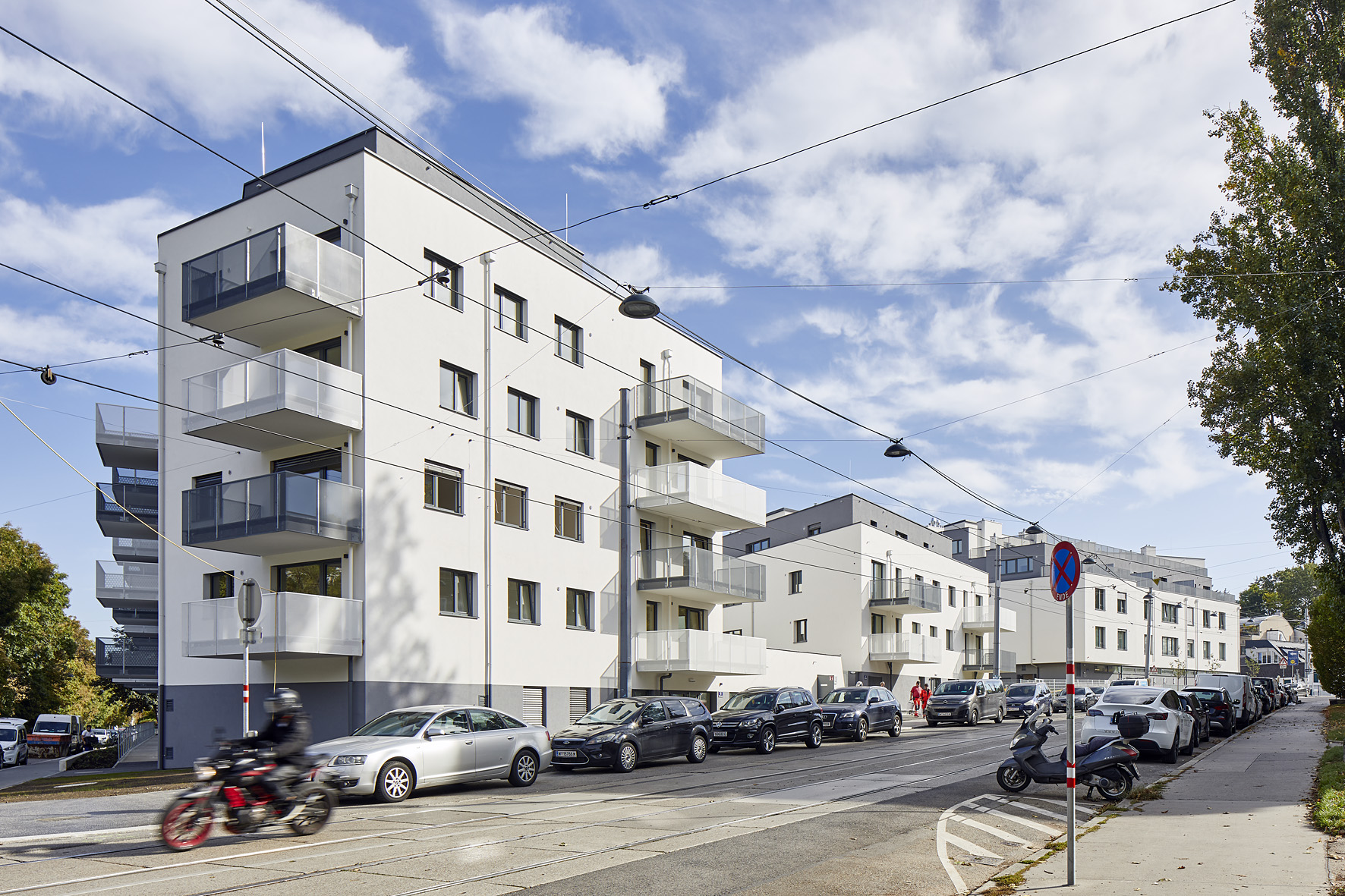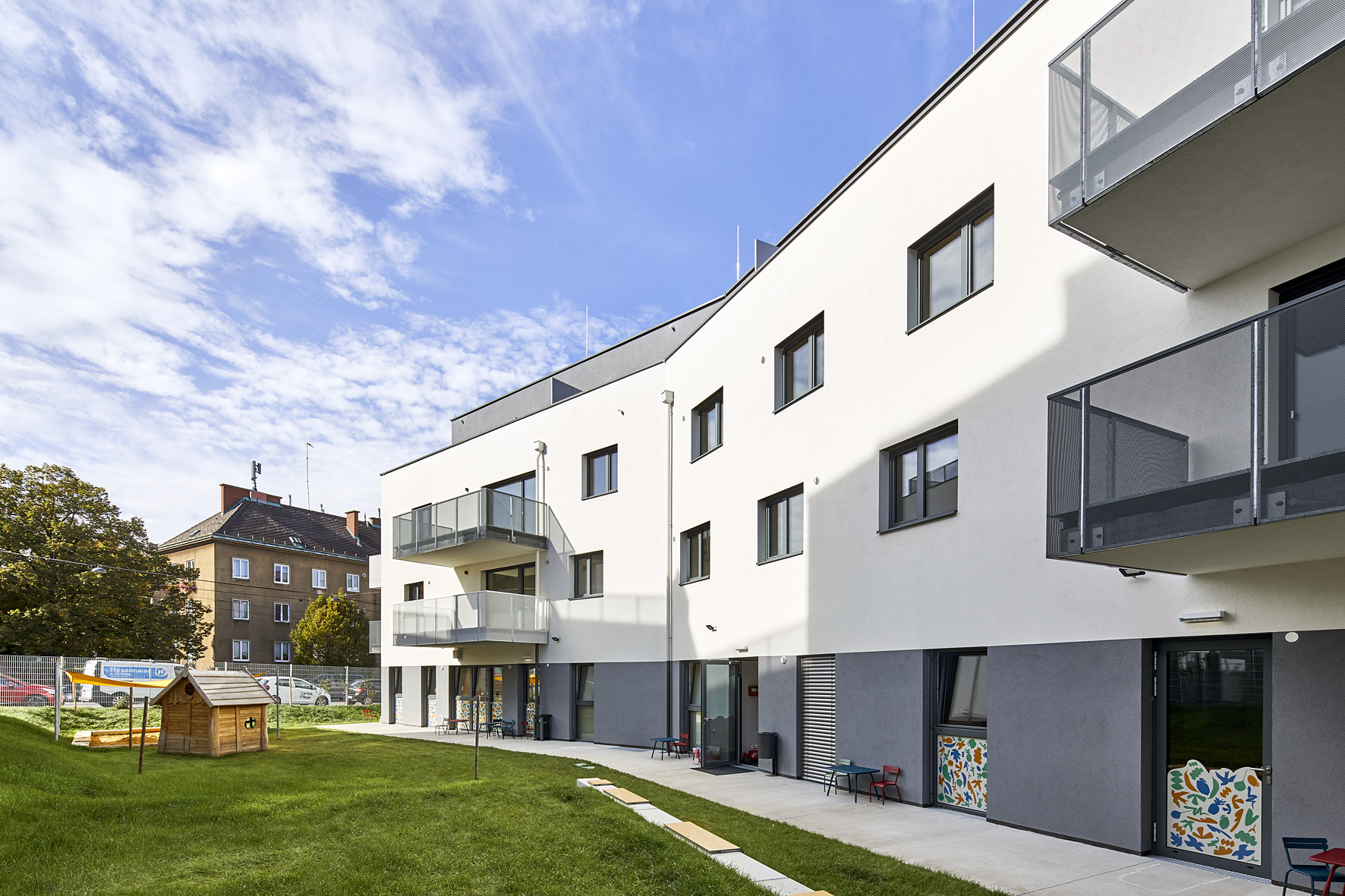 Wohnen am Fuße des Schafberges | freifinanzierte MieteDas vorstädtische Quartier an der Alszeile, Ecke Vollbadgasse und Dornbacher Straße im 17. Wiener Gemeindebezirk setzt sich aus drei Bauteilen zusammen und ist über eine gemeinsame Tiefgarage verbunden. Von der Dornbacher Straße ausgehend gelangt man über einen Park mit Altbaumbestand zum Eingang des Caritas-Wohnheimes mit 60 Betten inklusive des Gesundheitszentrums sowie einer Geschäftsfläche für die Nahversorgung. Der Kindergarten und der Zugang von 15 freifinanzierten Mietwohnungen erfolgt über das zweite Haus über die Vollbadgasse. Der dritte Teil des Ensembles, in dem 45 freifinanzierte Mietwohnungen, die Einfahrt zur Tiefgarage mit 103 Stellplätzen sowie das Ärztezentrum „Gesundheitspark Göttlicher Heiland Wien“ Platz finden werden, wird über die Alszeile erschlossen sein.