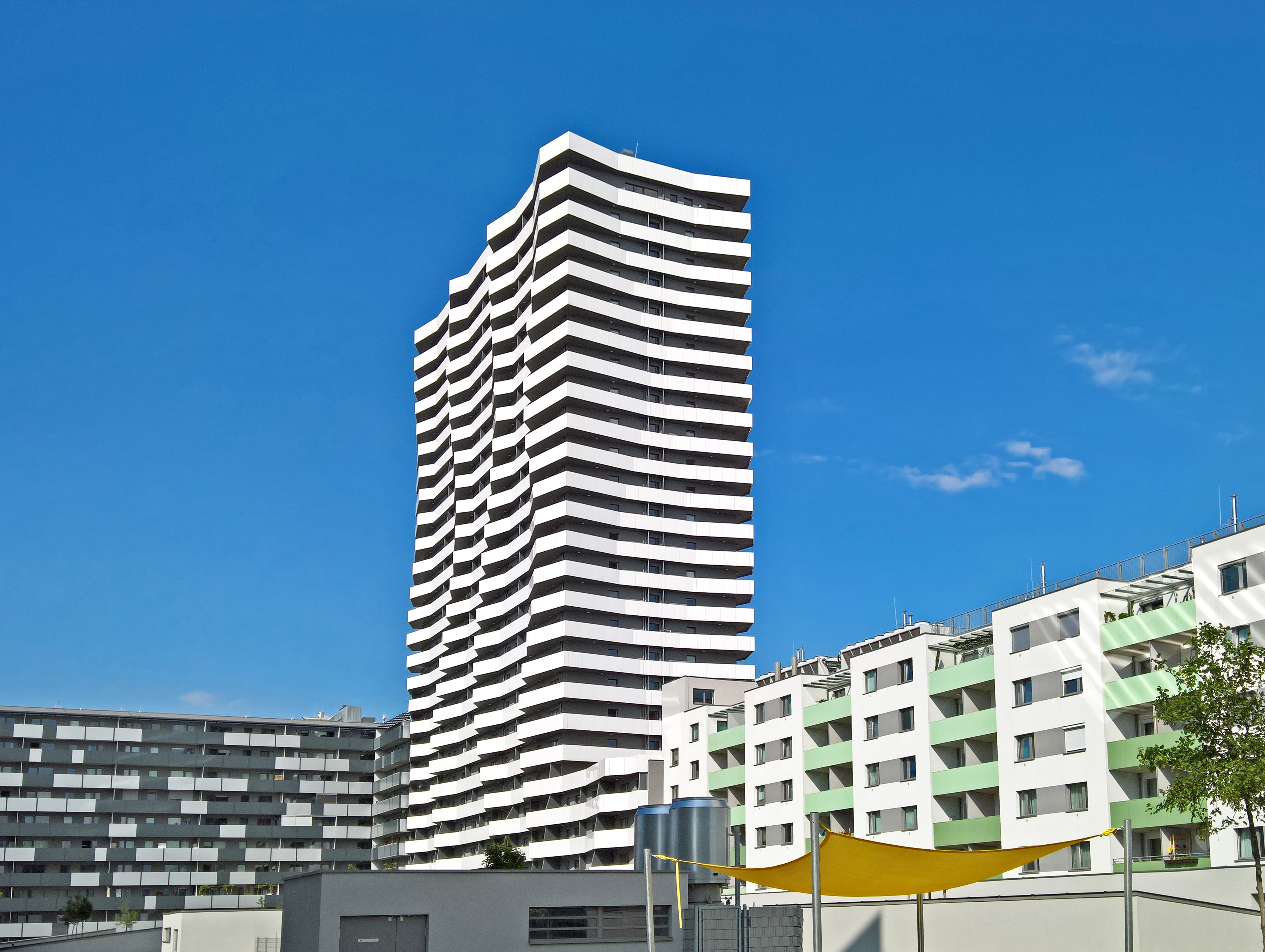 Insgesamt 301 freifinanzierte Wohneinheiten wurden in dem 85 Meter hohen Tower errichtet. Vom room4rent-Apartment für Kurzzeitmiete, über Mietwohnungen mit praktischen Grundrissen, bis hin zum Penthouse mit 155 m² Wohnfläche! Das vom Architekturbüro querkraft entworfene Hochhaus begeistert mit seiner außergewöhnlichen Gestaltung. Die unterschiedlich auskragenden Loggien und Balkone entlang jedes Stockwerkes umhüllen die Fassade und verleihen dem Tower sein unverwechselbares und fließendes Erscheinungsbild.