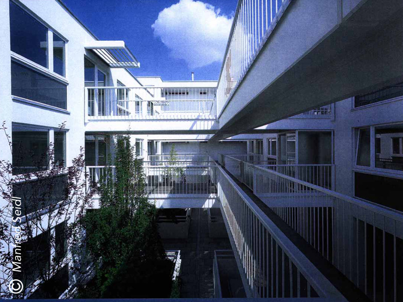 Wohnen und Arbeiten in der DonaustadtDas Österreichische Siedlungswerk hat gemeinsam mit dem Architekten Helmut WIMMER insgesamt 112 geförderte Mietwohnungen errichtet. Diese teilen sich auf 5 Stiegenhäuser auf.