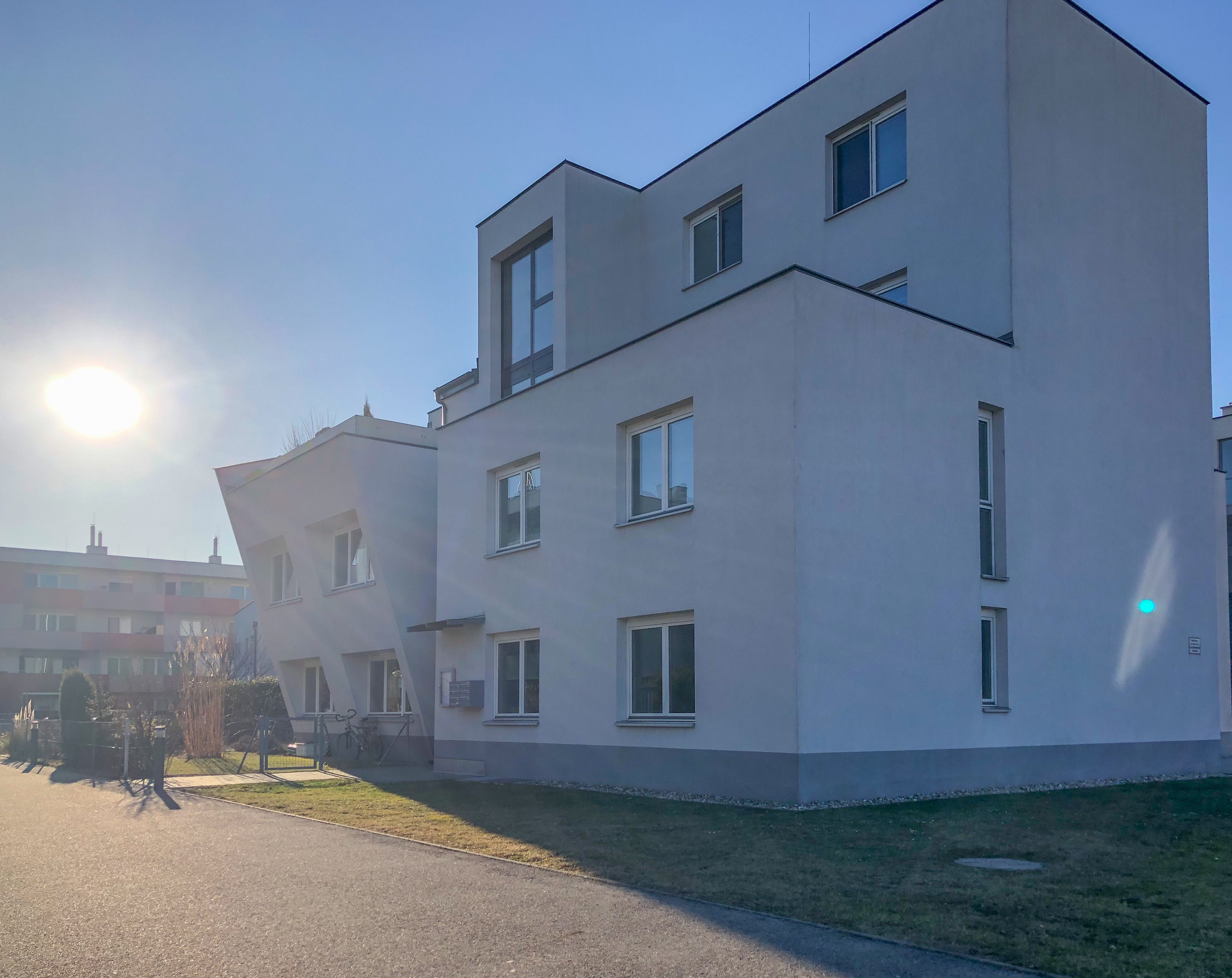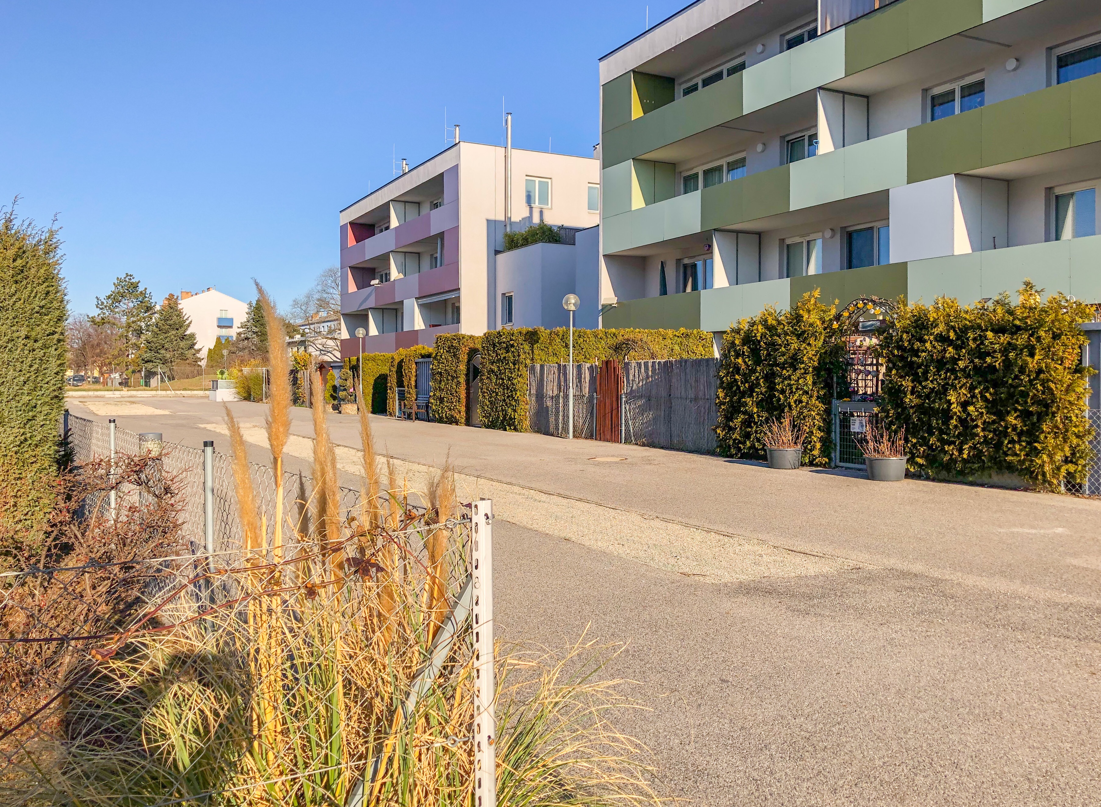 Durch die offene Bebauung der Häuser, sind idyllische Allgemeinfreiflächen für die Bewohner entstanden. Entlang des Baumbepflanzten Weges reihen sich ein Kleinkinderspielplatz, ein Gemeinschaftsgarten sowie ein Kinderspielplatz, welcher auch von den Bewohnern der Nachbarliegenschaft benützt wird.