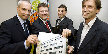 Wissenschaftsminister Hahn bei Dachgleiche des ÖSW-Passivhausprojekts Kandlgasse