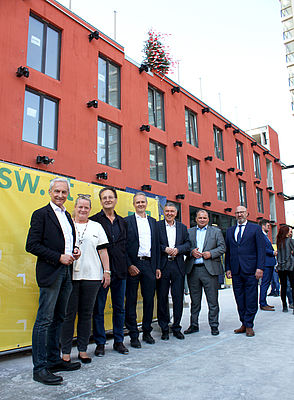 Anlässlich der Fertigstellung des Rohbaus nahmen zahlreiche Vertreter der Stadt, der Bauherrenschaft, der Baufirma sowie des Architektenteams und der Konsulenten an der Feier teil, darunter Bezirksvorsteher-Stellvertreterin Susanne Wessely, ÖSW-Vorstandsvorsitzender Michael Pech und Vorstandsdirektor Markus Fichta, room4rent-Geschäftsführerin Helga Mayer sowie für die Firma Porr, die das Projekt um-setzt, Alfred Vandrovec und Martin Schilling sowie zahlreiche weitere Gäste. Die ÖSW-Vorstände über-gaben das Gleichengeld an die Poliere und Caroline Szeremley sprach den Gleichenspruch.
