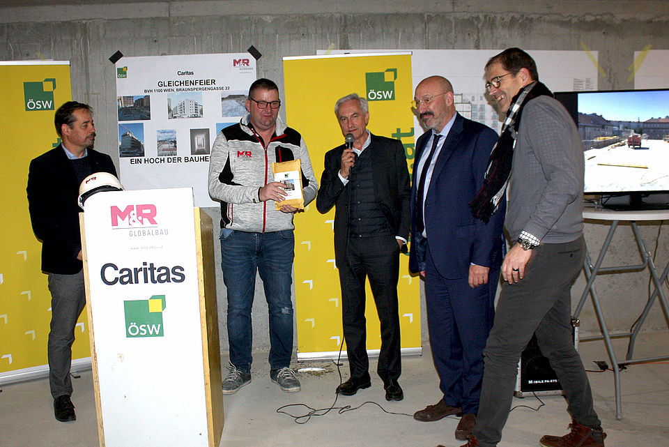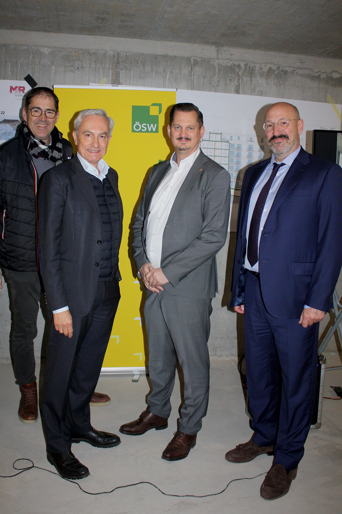 Anlässlich der Fertigstellung des Rohbaus nahmen Bezirksvorsteher Marcus Franz und Bezirksrat Bernhard Schmid, für das ÖSW der Vorstandsvorsitzende Michael Pech und Vorstandsdirektor Markus Fichta, sowie Vertreter der Baufirma M&R Globalbau, der Architekten der amm zt-gmbh und der Konsulenten an der Feier teil.
