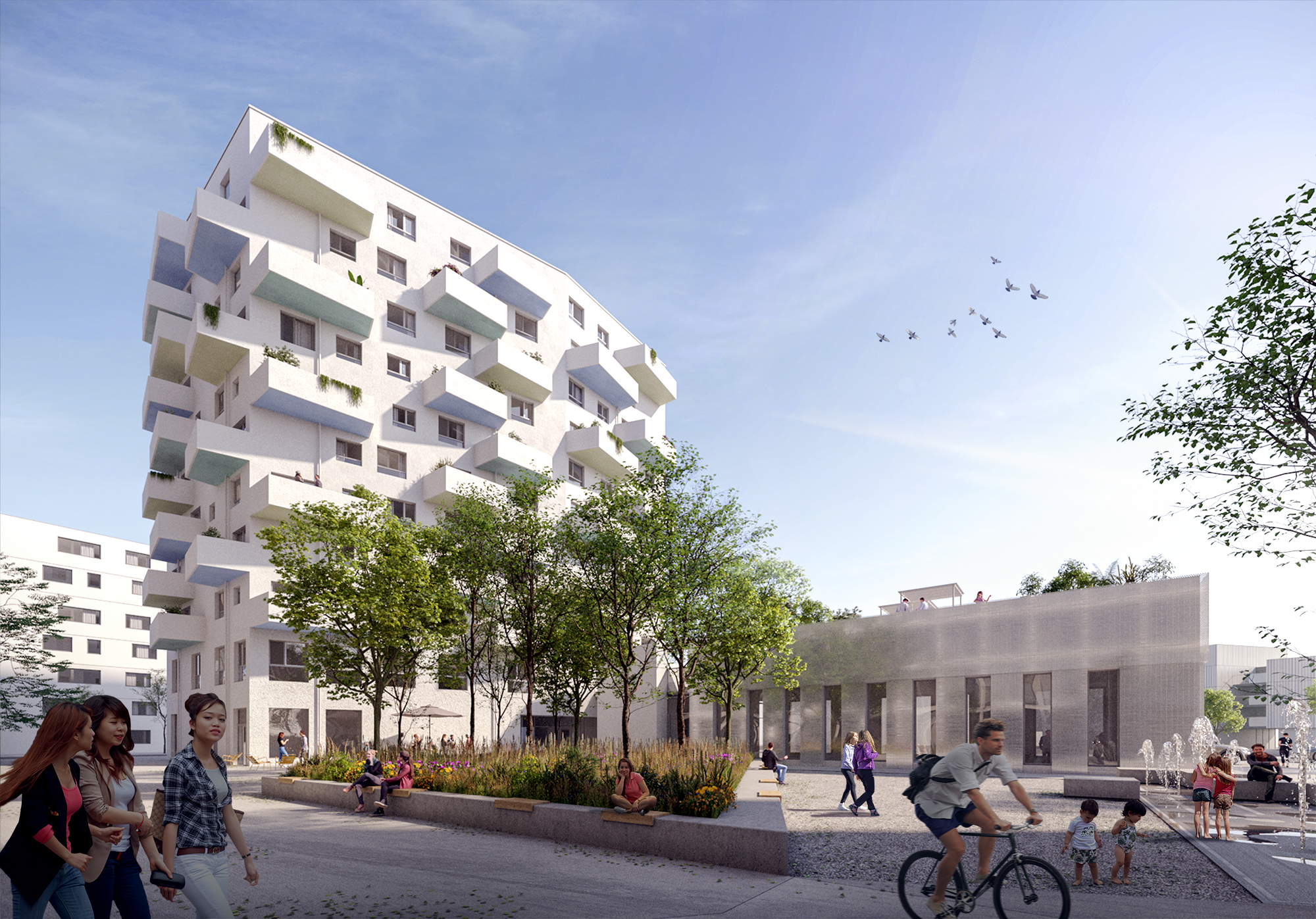 Kompakte Wohnungsgrundrisse ermöglichen leistbares Wohnen mit Qualität. Alle Wohnungen verfügen über eine private Freifläche in Form einer Loggia oder eines Balkons sowie einen Einlagerungsraum im zweiten Untergeschoß. Im ersten Obergeschoß befindet sich ein Gemeinschaftsraum sowie der Zugang zum Dach des flachen Hallenbauwerks. Dieses ist über eine Brücke mit dem Wohnturm verbunden und steht den Bewohnern als Gemeinschaftsterrasse mit Kleinkinderspielbereich zur Verfügung.