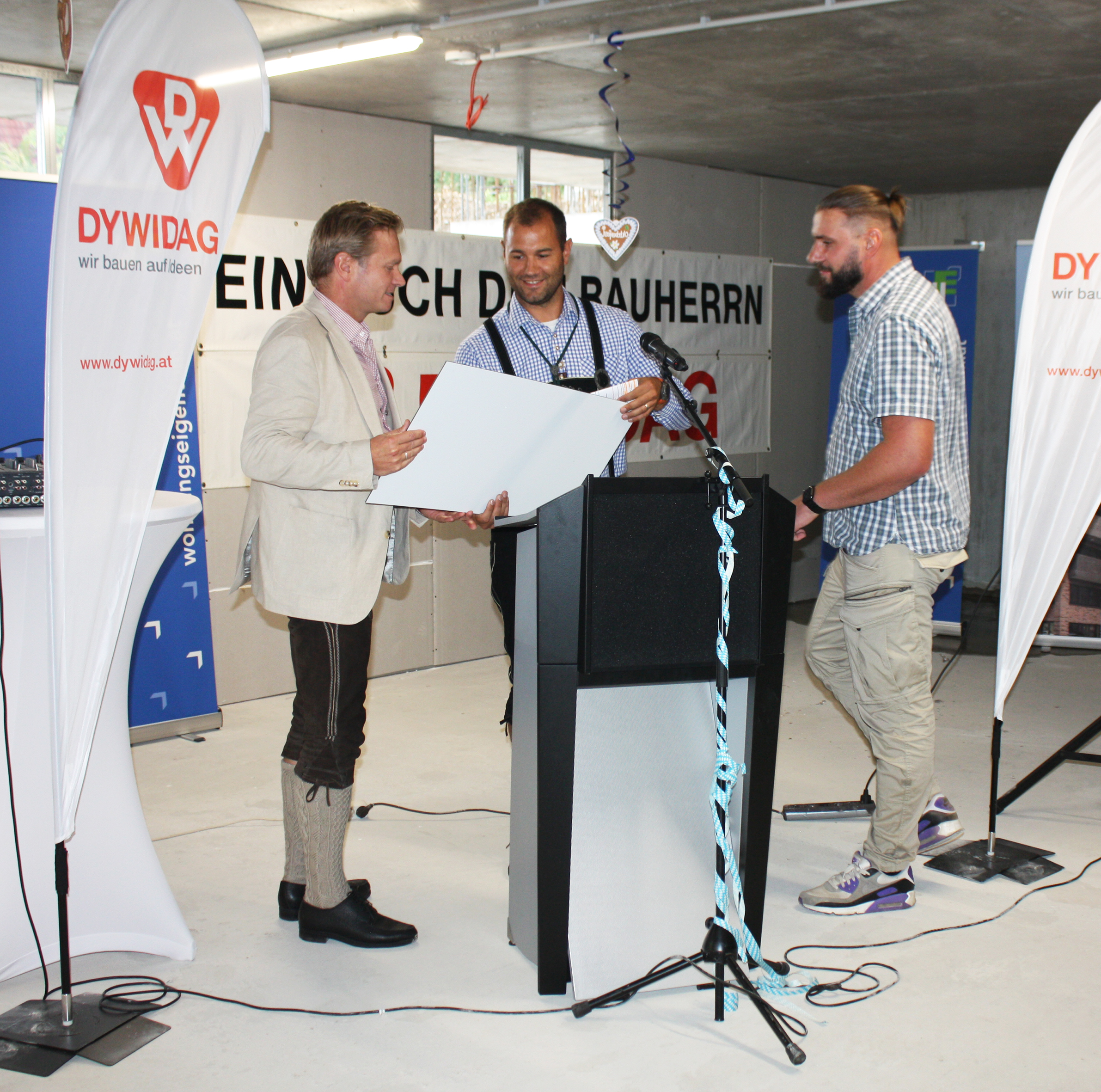 Anlässlich der Fertigstellung des Rohbaus nahmen zahlreiche Vertreter der Bauherrenschaft, der Baufirma sowie des Architektenteams und der Konsulenten an der Feier teil: Helmut Kubasta, einer der beiden Geschäftsführer der »Wohnungseigentum« GmbH, für die Generalplaner der S + B Gruppe Vorstand Wolfdieter Jarisch, Dywidag‐Geschäftsführer Gerald Höninger sowie Architekt Djordje Milosevic. Oberbauleiter Erik Palmisano begrüßte die Gäste mit interessanten Fakten zum Projekt. Demnach wurde die Dachgleiche bereits einen Monat früher als geplant – nach genau 220 Arbeitstagen – erreicht.