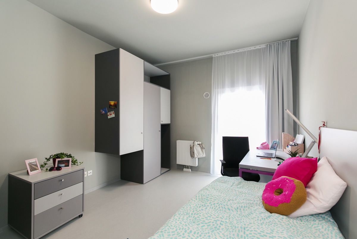 Das Niedrigenergiehaus wurde nach modernstem Standard errichtet und bietet den Studenten neben der eigenen vier Wänden attraktive Gemeinschaftsräume wie zwei Musikräume, einen Partyraum und eine große Dachterrasse zur flexiblen Nutzung. Mit Sauna und Dampfbad sowie einem Fitnessraum können die Studenten ausspannen und alle Vorzüge eines modernen Studentenwohnheimes genießen.