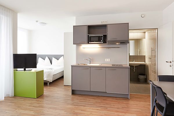 Die Apartments verfügen über die perfekte Ausstattung für ihre Mieter auf Zeit. In der möblierten Küchenzeile finden die Bewohner unter anderem Geschirrspüler, Mikrowelle und Kühlschrank. Alle, die ohne Umzugstransporter anreisen, können vor Ort bequem Küchensets anmieten. Selbiges gilt für Bettwäsche, Handtücher und Co. Flexibel und komfortabel lautet auch das Motto bei den zumietbaren Services: Von Reinigung und Wäscheservice, über Sauna und Fitnessraum – bei room4rent können verschiedenste Produkte und Dienstleistungen einfach online gebucht werden. Hierbei können die Mieter selbst entscheiden, ob sie beispielsweise gerne dauerhaft eine wöchentliche Reinigung buchen möchten oder nur alle zwei Monate Unterstützung in Ihrem Haushalt auf Zeit benötigen. Über eine Vielzahl von Services und Ausstattungspaketen hinaus, steht vor Ort ein Concierge mit vielen Tipps für alle Alltagsbelange zur Verfügung, der auch als Kommunikationsschnittstelle im Haus dient. Der Concierge ist Bezugsperson bei Ankunft und Abreise und steht für alle Fragen rund um Service- und Ausstattungspakete zur Verfügung.