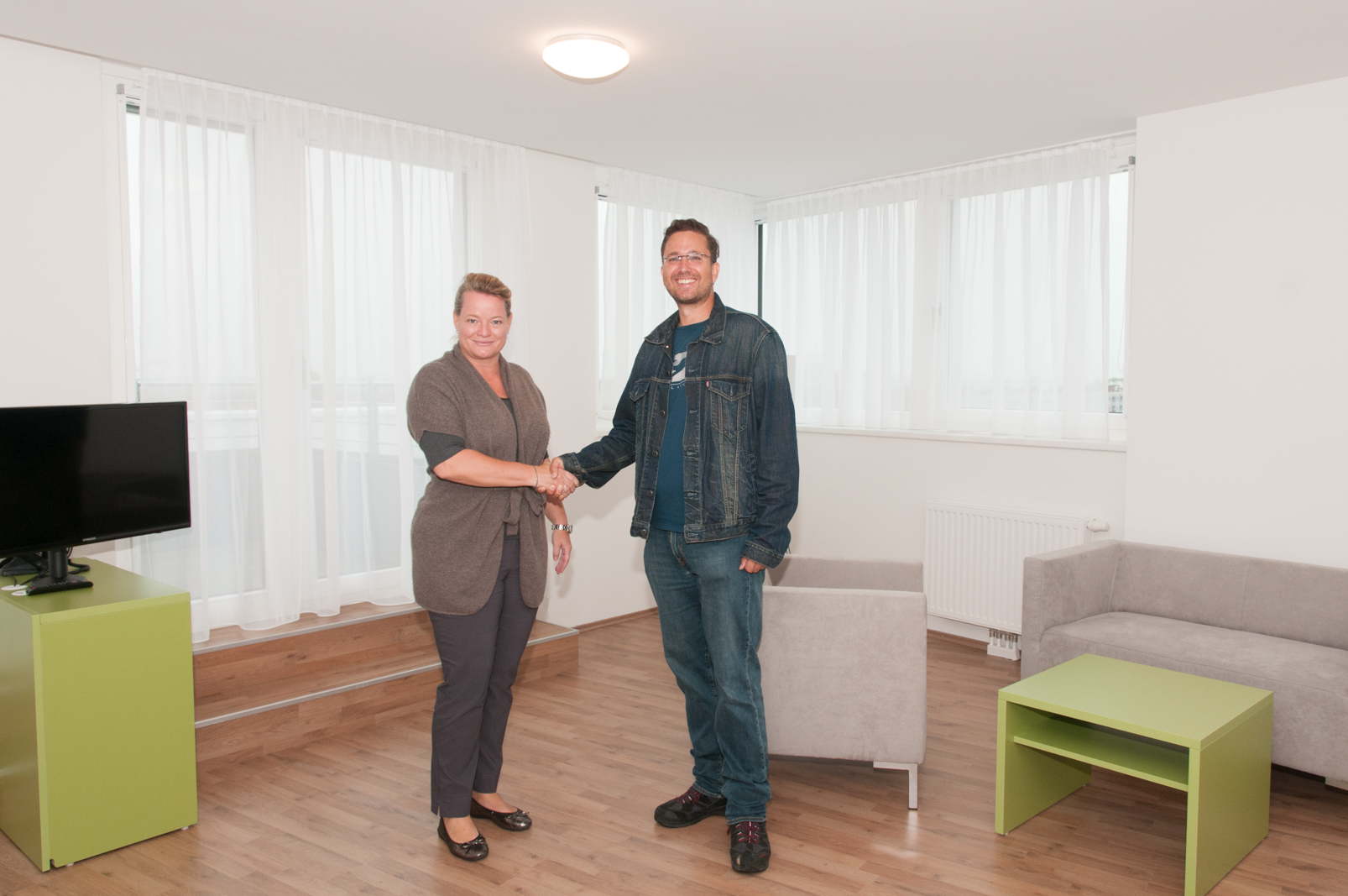 room4rent-Geschäftsleiterin Helga Mayer bei der Schlüsselübergabe an die ersten Bewohner: „Wir freuen uns, dass wir mit room4rent vielen Menschen ein komfortables Zuhause auf Zeit geben können und hoffen, dass sich die Mieter auch im room4rent-Haus Messecarrée Nord rundum wohl fühlen werden! Besonders stolz sind wir auf die Lage des Projektes: mit direkter U-Bahn-Anbindung, der Messe Wien und der Wirtschaftsuniversität vor der Haustüre, können wir hier einen perfekten Standort für Kurzzeitwohnen bieten.“