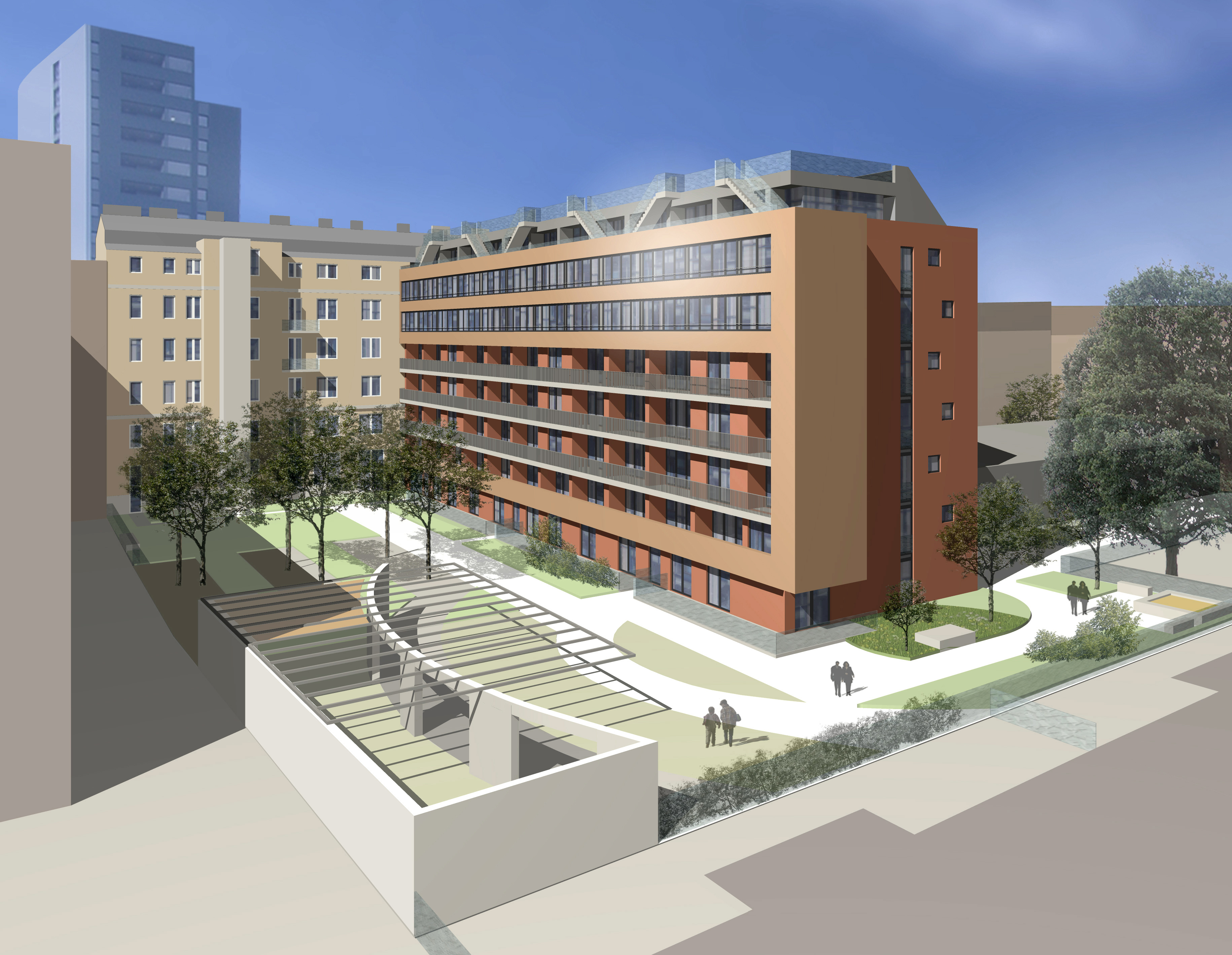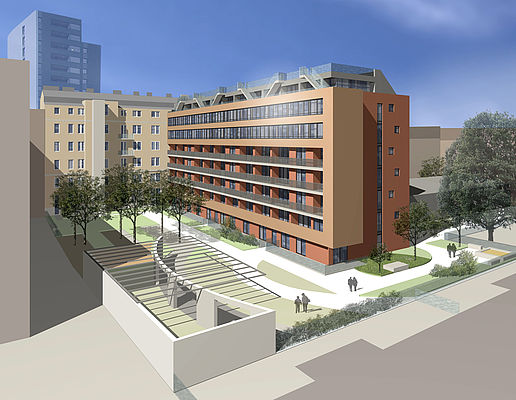 Im August 2009 begann das Österreichische Siedlungswerk (ÖSW) die vom Architekturbüro Hermann & Valentiny u. Partner geplanten Wohnungen zu errichten. Das Grundstück liegt im Bereich des Neuentwicklungsgebietes Höchstädtplatz. An ein Bestandsobjekt wurde hier ein Hoftrakt angeschlossen. Hier entstehen die 65 geförderten Mietwohnungen mit Wohnungsgrößen zwischen 57 und 123 m², die teilweise als Maisonetten ausgeführt sind und die durch ihre ruhige Lage bestechen. Die vier Dachgeschossmaisonetten mit Größen zwischen 120 und 147 m² entstehen auf dem bestehenden angrenzenden Altgebäude. Diese freifinanzierten Eigentumswohnungen bieten hochwertige Ausstattung einen schönen Ausblick und hochwertige Ausstattung. Die Eigentumswohnungen verfügen über zwei großzügige Terrassen, große Fensterflächen, großteils natürlich belichtete Bäder, hochwertige Sanitärausstattung und Parkettboden in allen Aufenthaltsräumen. Die großzügig geschnittenen Grundrisse lassen Freiraum für eine individuelle Gestaltung.