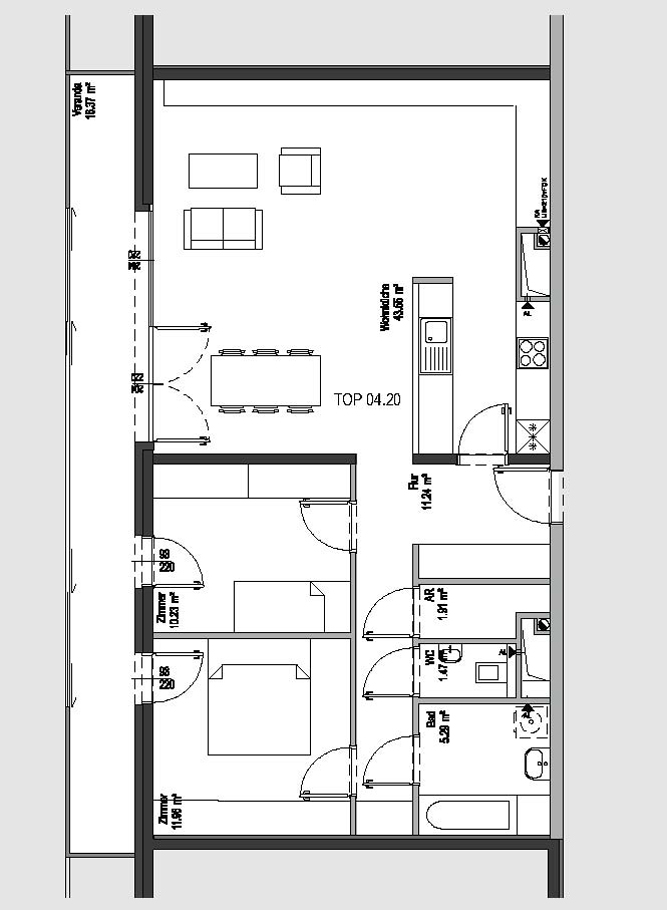 Diese Wohnanlage bietet eine Vielfalt an Wohnungstypen. Das Spektrum reicht von der kleineren Wohnung über Maisonetten bis zu Wohnungen mit geräumigen Terrassen. Grundelement ist ein durchgesteckter zweigeschossiger Wohnungstyp. Die Größen reichen von 45 bis 130 m². Zum einen wurde ein Maisonettetyp geplant, der im Eingangsbereich mit einer kleinen internen "Einliegerwohnung" ausgestattet ist. Je nach Familiensituation kann dieser Raum, der über eine eigene Nasszelle verfügt, als Jugendzimmer, Gästezimmer oder Arbeitsraum genutzt werden. Der andere Maisonettetyp weist im Eingangsbereich eine großzügige, natürlich belichtete Nische auf, die auch eine vielseitige Verwendung zulässt. Der Großteil der Wohneinheiten verfügt über Veranden mit großzügigen Schiebeelementen, die ein lichtdurchflutetes Wohnerlebnis ermöglichen. Die Wohnungen im Erdgeschoß sind mit südseitigen Mietergärten ausgestattet. So verfügt jede Wohnung über eine spezielle Freiraumlösung. Für ein angenehmes Raumklima sorgt der Holzboden, der in Wohnzimmer, Schlafzimmer und Wohnküche verlegt wird. Das Wohnprojekt wurde als Niedrigenergiehaus geplant. Über die Veranden wird in Kombination mit großzügigen Fensterflächen die passive Sonnenenergie optimal genutzt. Die kontrollierte Wohnraumlüftung sorgt für gute Luftqualität im Innenraum. In der Wohnanlage ermöglichen ein Gemeinschaftsraum, der begrünte Innenhof sowie ein Kleinkinderspielplatz Kontakt und Kommunikation unter den Bewohnern.