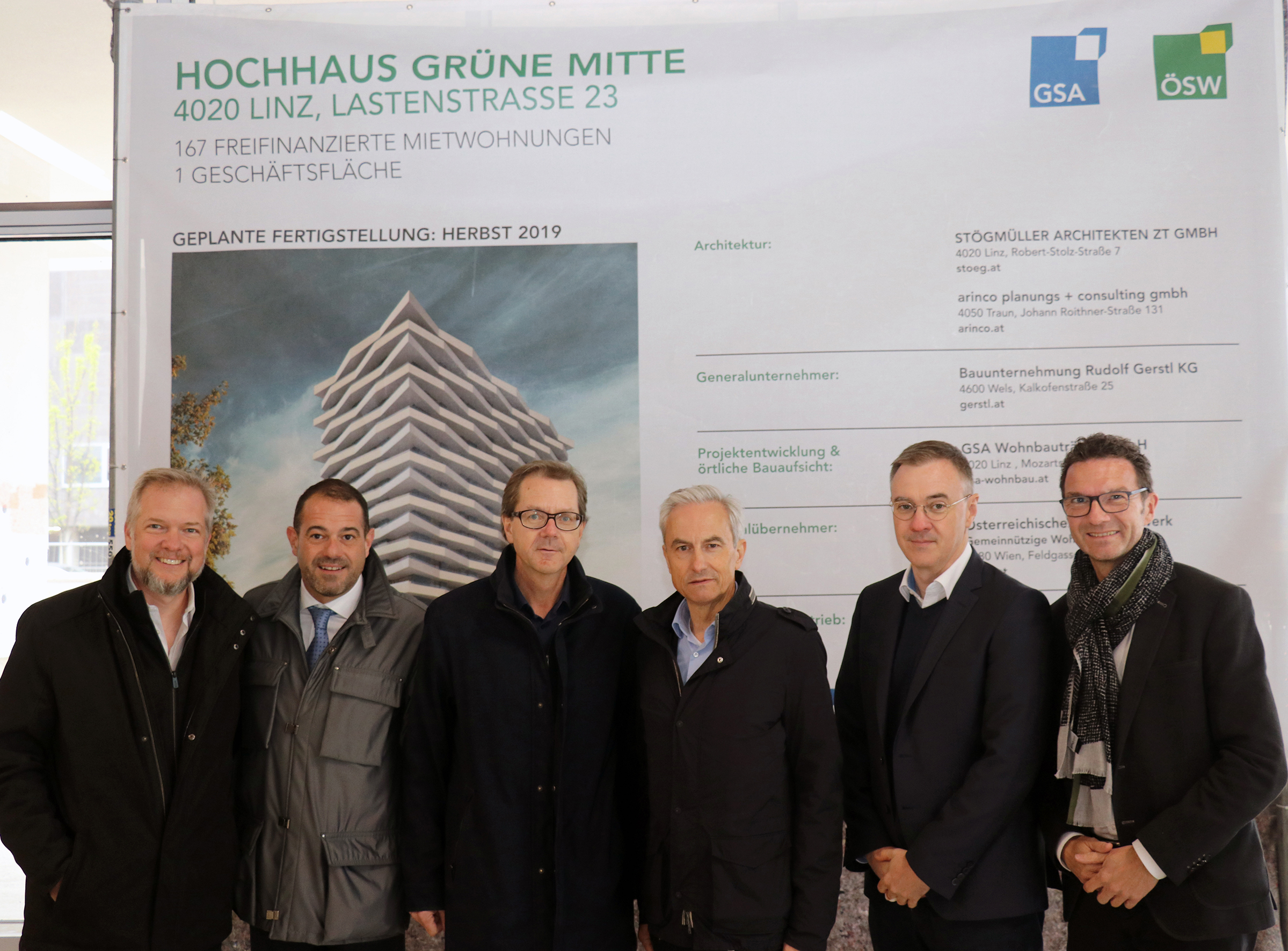 Auf dem Areal des ehemaligen Frachtenbahnhofs in Linz entsteht mit der „Grünen Mitte“ ein neuer Stadtteil mit gemeinschaftlichen Grünflächen in zentraler Lage. Bis Ende 2019 errichtet hier die ÖSW AG in Kooperation mit der GSA Wohnbauträger GmbH als Generalübernehmer im Auftrag der ERSTE Immobilien KAG ein Wohnhochhaus. Im April wurde die traditionelle Dachgleiche gefeiert.