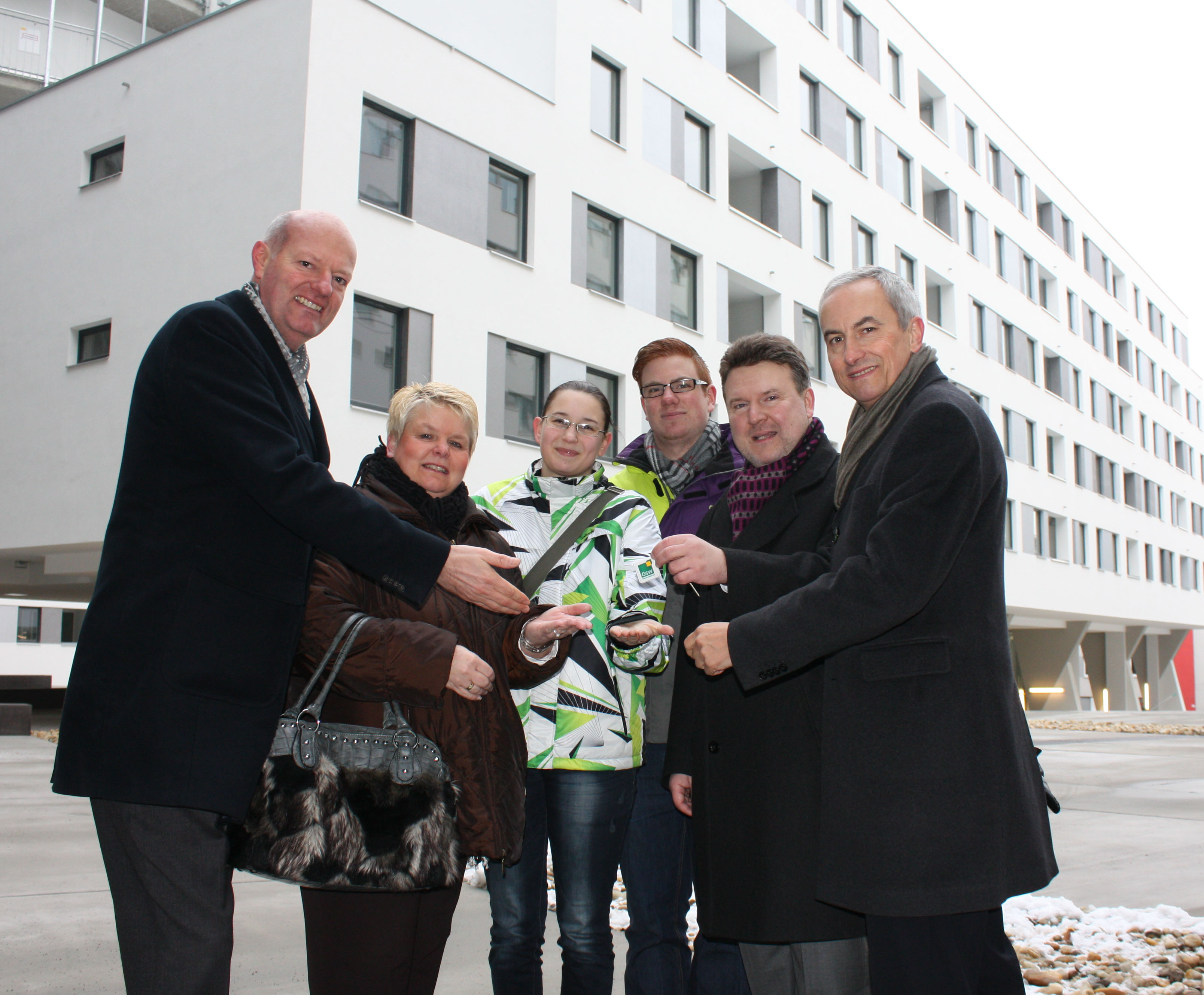 Nach knapp 2,5 Jahren Bauzeit war es am Mittwoch, 18. Jänner 2012, so weit: Die insgesamt 272 Mietwohnungen des ÖSW Projektes in der Donaufelder Straße 148-150 im 22. Bezirk wurden fertiggestellt. Die Bewohner konnten sich über den Einzug in ihr neues Zuhause freuen. Auch Wohnbaustadtrat Michael Ludwig war dabei, als Großfamilien genauso wie Paare und Singles erstmals ihre neuen Schlüssel überreicht bekamen.