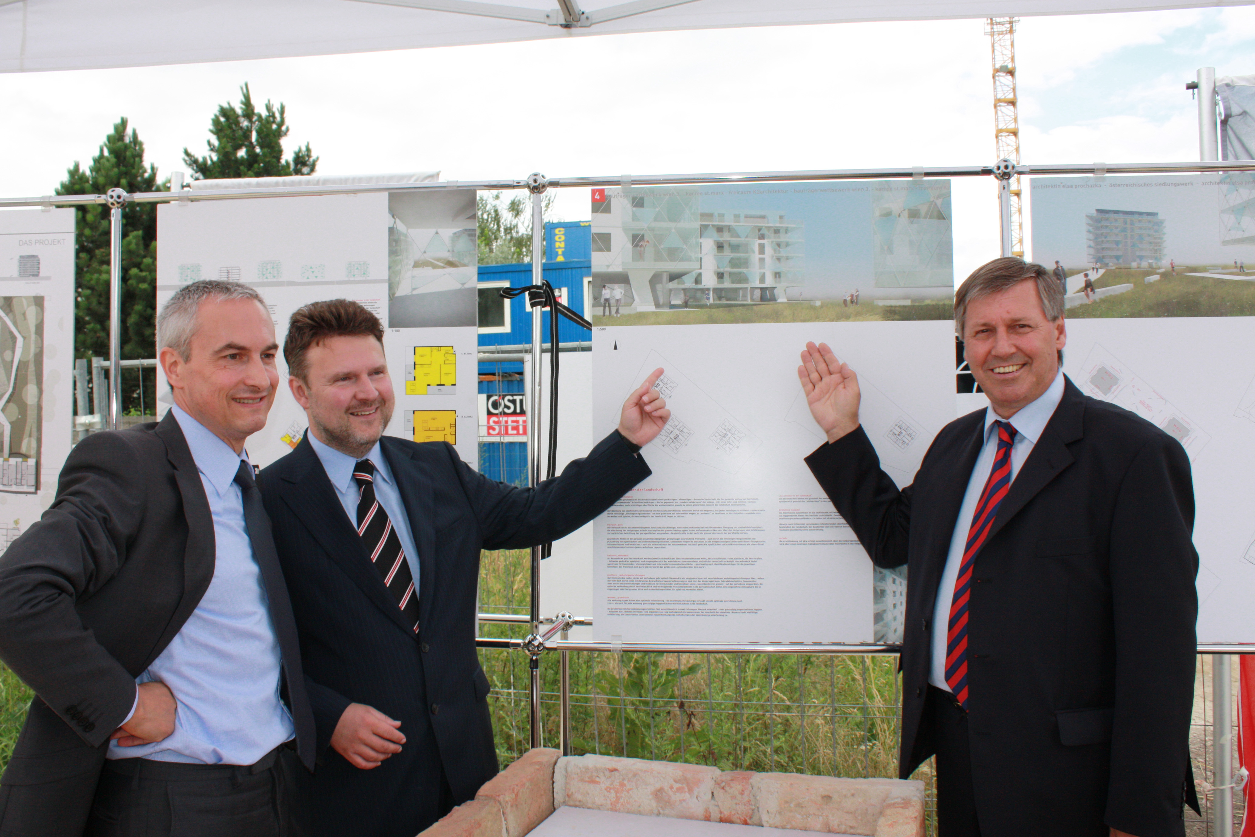 Wien - Am Freitag, dem 4. Juli 2008, erfolgte die offizielle Grundsteinlegung für das ÖSW-Wohnprojekt Karree St. Marx. Das Österreichische Siedlungswerk (ÖSW) errichtet hier bis Sommer 2010 eine Wohnanlage mit insgesamt 118 geförderten Mietwohnungen mit Eigentumsoption. Der Wiener Wohnbaustadtrat Michael Ludwig, Bezirksvorsteher Erich Hohenberger sowie die beiden Vorstände des ÖSW Michael Pech und Wolfgang Wahlmüller griffen zur Spachtel und gaben damit den offiziellen Startschuss für das Projekt. Das Österreichische Siedlungswerk hat sich in einem Bauträgerwettbewerb mit einem Entwurf von Architektin Elsa Prochazka gegen 17 Mitbewerber als Sieger für den Bauplatz C im Projektgebiet Karree St. Marx an der Schlachthausgasse/Viehmarktgasse durchgesetzt. Das Projekt überzeugte mit durchdachten Grundrissen, einer architektonisch herausragenden Gesamtgestaltung, einer optimalen Integration der drei Baukörper in die Freiraumlandschaft sowie durch ökologische Projektdetails. Das neue Wohngebiet "Karree St. Marx" ist Teil der Stadtentwicklungszone "Neu Erdberg - Simmering".