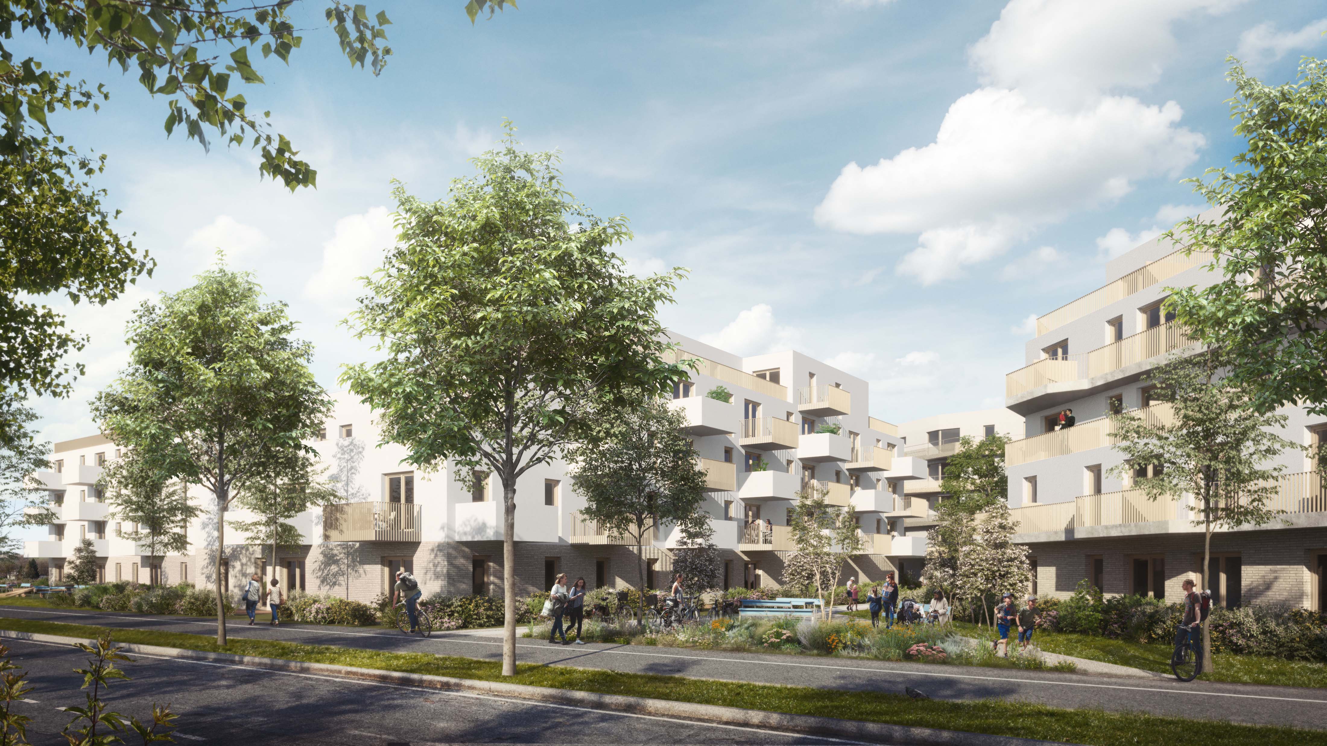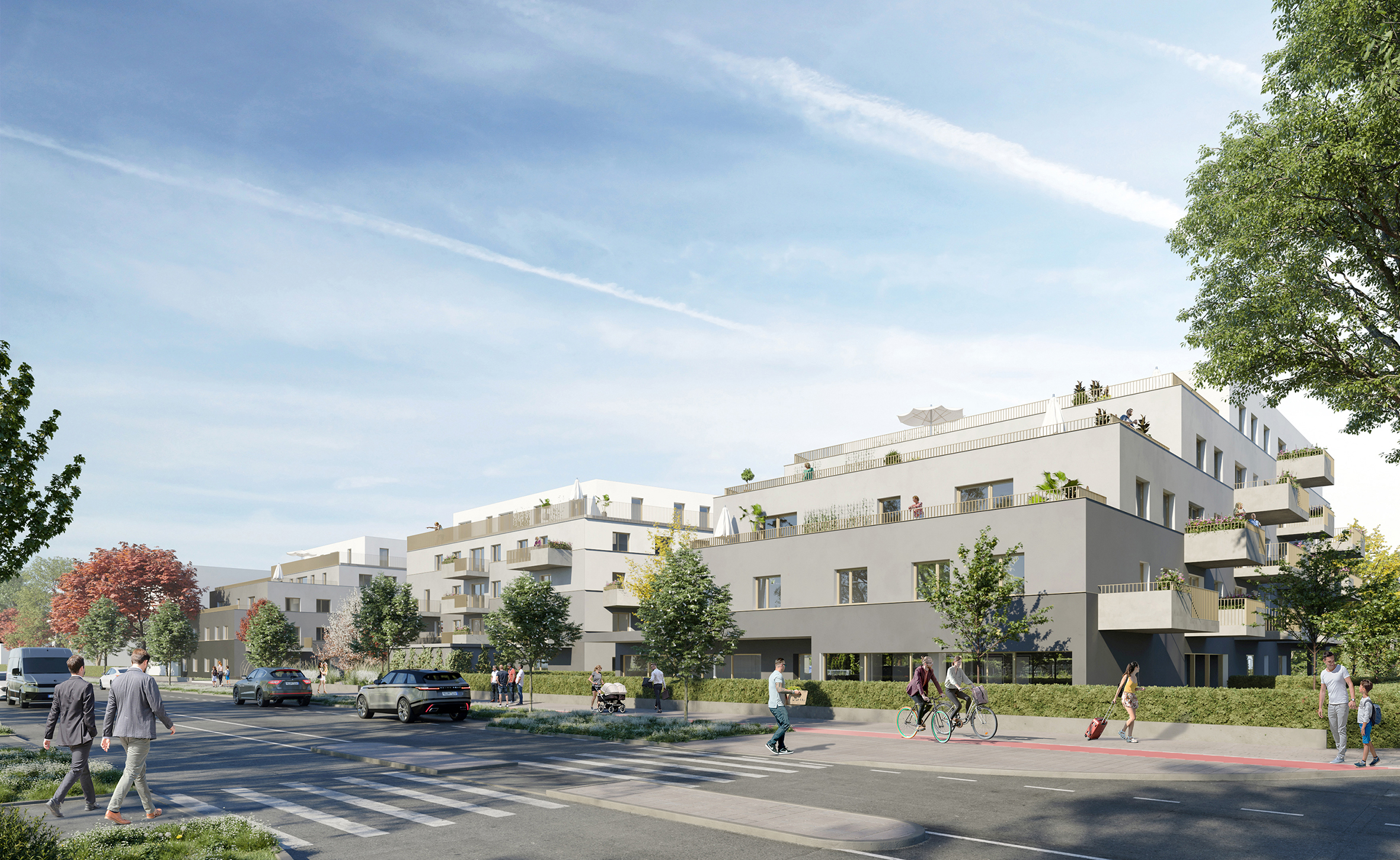 Aber nicht nur die Energieversorgung ist nachhaltig. Rund zwei Drittel des insgesamt rund 2,6 Hektar großen Quartiers stehen den Bewohner*innen als Grün- und Freiflächen zur Verfügung. Die Esplanade verläuft als grüne Achse einmal quer durch das Areal und verbindet alle Gebäude mit dem zentralen Quartiersplatz. Ein großer Jugendspielplatz entsteht direkt vor dem angrenzenden Wald- und Wiesengebiet. Kleinkinderbereiche gibt es auf jedem der drei Baufelder. Insgesamt mehr als 200 neue Bäume spenden Schatten und Frischluft.