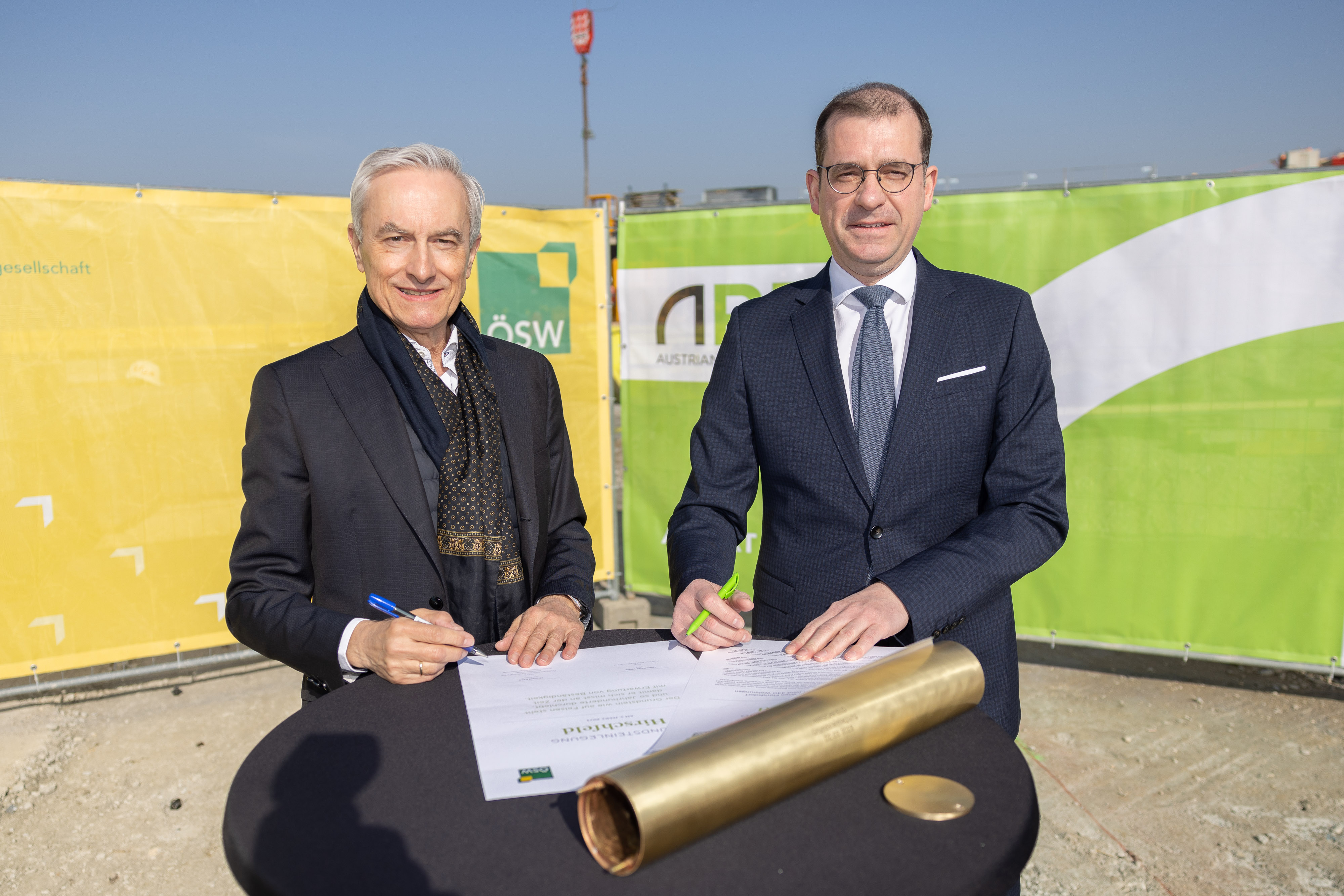 ARE und ÖSW errichten in Wien Floridsdorf ein nachhaltiges Quartier mit 440 Wohnungen und groß- zügigen Freiflächen. Am Donnerstag, 02.03.2023, wurde offiziell der Grundstein gelegt.