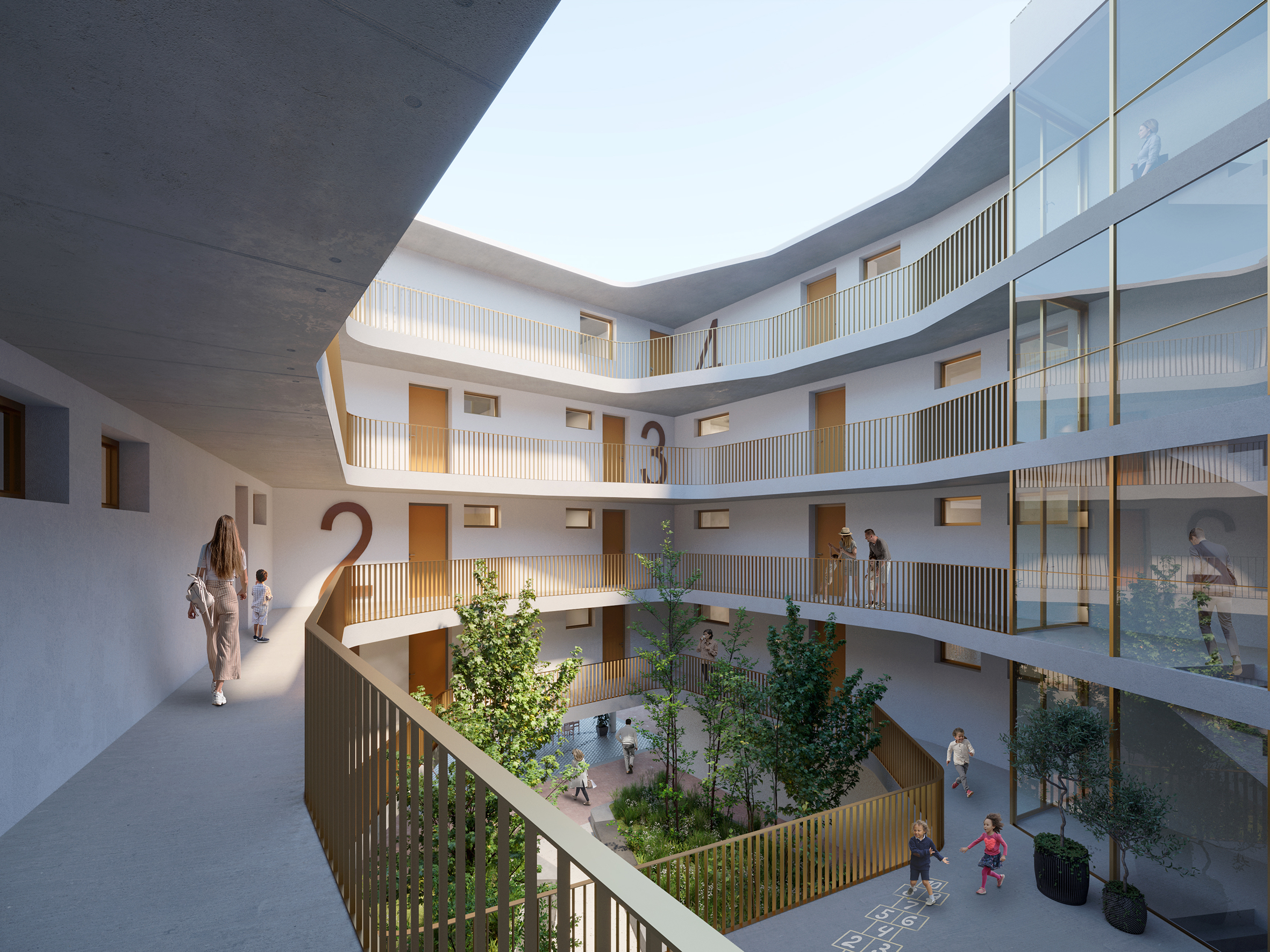 Zwei der Wohngebäude in der Planung von PLOV Architekten sind als Terrassenhäuser angelegt, die zur Gerasdorfer Straße hin abgetreppt sind, und sich mit der niedrigeren straßenseitigen Ansicht auf die umgebende Bebauung beziehen. Der dazwischenliegende Baukörper ist als Atriumhaus mit innenliegenden Laubengängen und einem begrünten Innenhof als Begegnungszone geplant. Alle Wohnungen verfügen über mindestens eine private Freifläche.