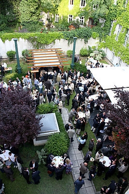 Neben den Erfrischungen an der Sekt- oder Cocktailbar konnten die Besucher natürlich diverse kulinarische Besonderheiten genießen. So wurden unter anderem Spanferkel und argentinische Rinderfilets vom Grill geboten. Das an den Innenhof angrenzende Kellergewölbe lockte mit Bier vom Fass und original Münchner Weißwürsten. Im schönen Innenhof des ÖSW in Wien-Josefstadt herrschte eine entspannte Atmosphäre.