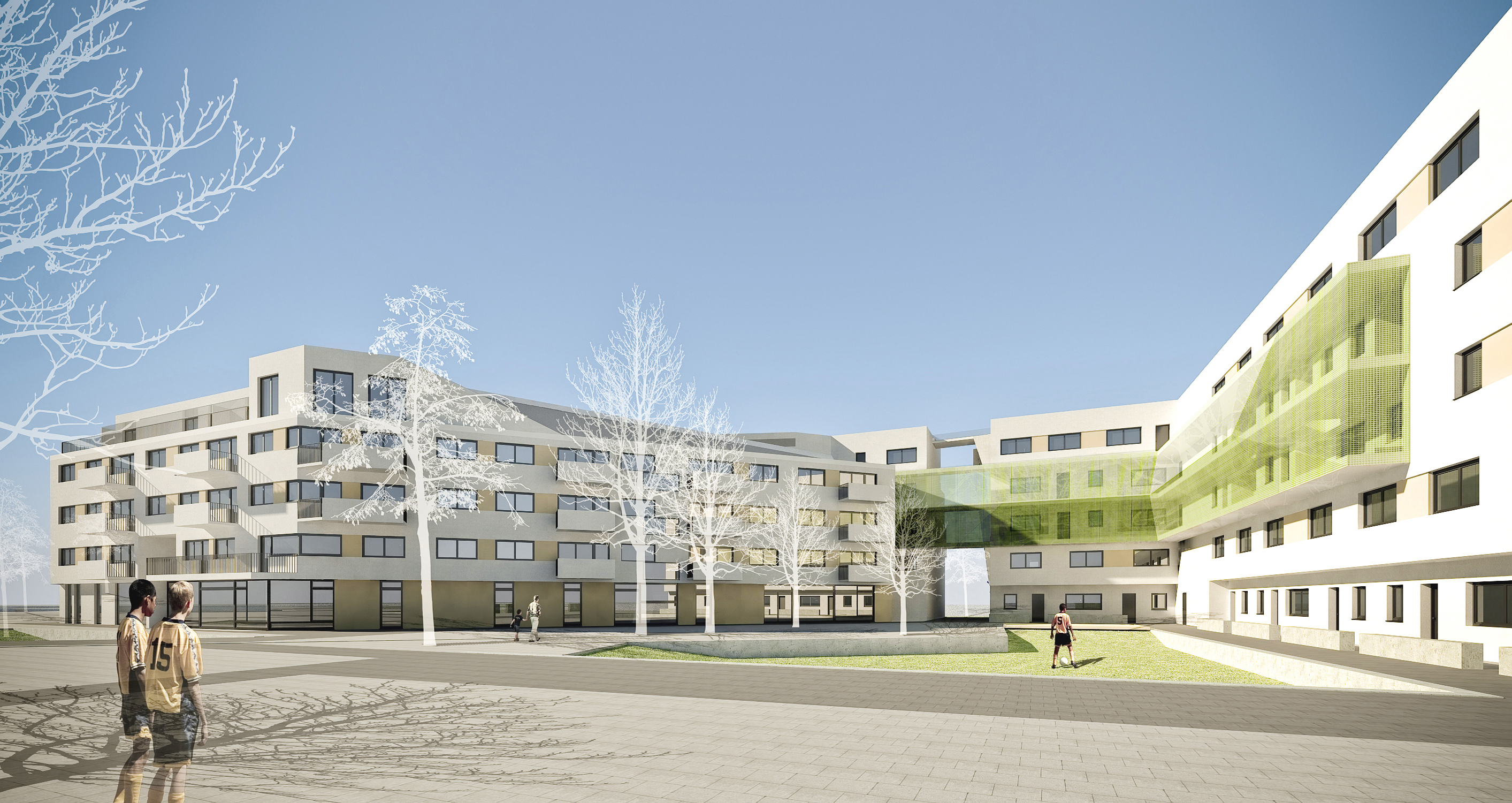 Neben der Sportlandschaft am Dach stellen eine Spiel- und Liegewiese sowie ein Kinder- und Jugendspielbereich mit Wasserspiel grüne Inseln in der Wohnanlage dar. Ebenso ist ein Kleinkinderspielbereich geplant. Die allgemeinen Freiräume im rückwärtigen Bereich sind als Streuobstwiesen gestaltet und dienen eher der ruhigen Entspannung.