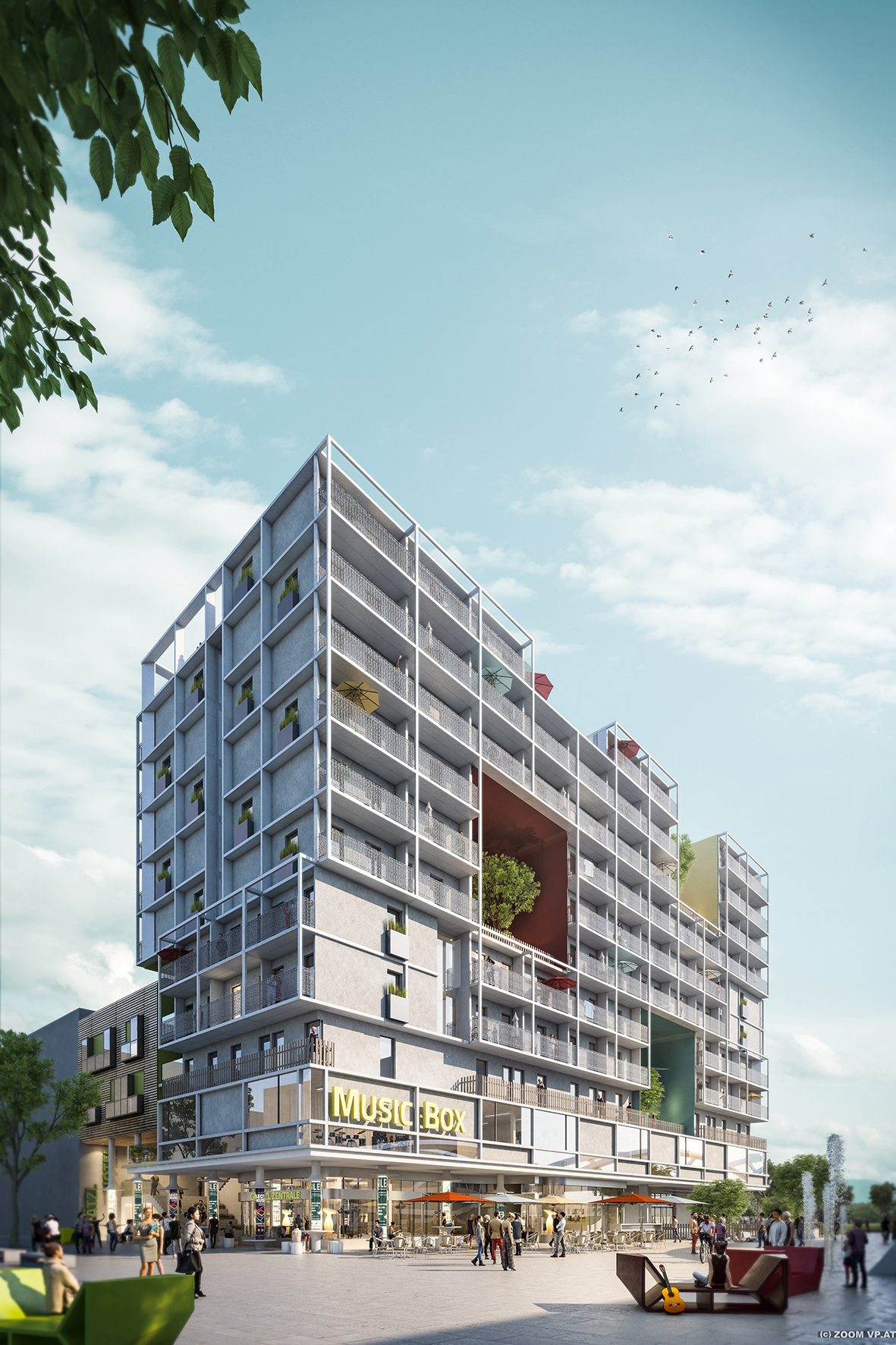 Die Österreichisches Siedlungswerk Gemeinnützige Wohnungsaktiengesellschaft realisiert mit der MUSIC-BOX im 10. Wiener Gemeindebezirk, südlich des Wiener Hauptbahnhofes am Helmut-Zilk-Park, in Kooperation mit dem Architektur-Studio heri&salli, Carla Lo Landschaftsarchitektur, art:phalanx und weiteren Partnern, ein der Musik gewidmetes Themenhaus.