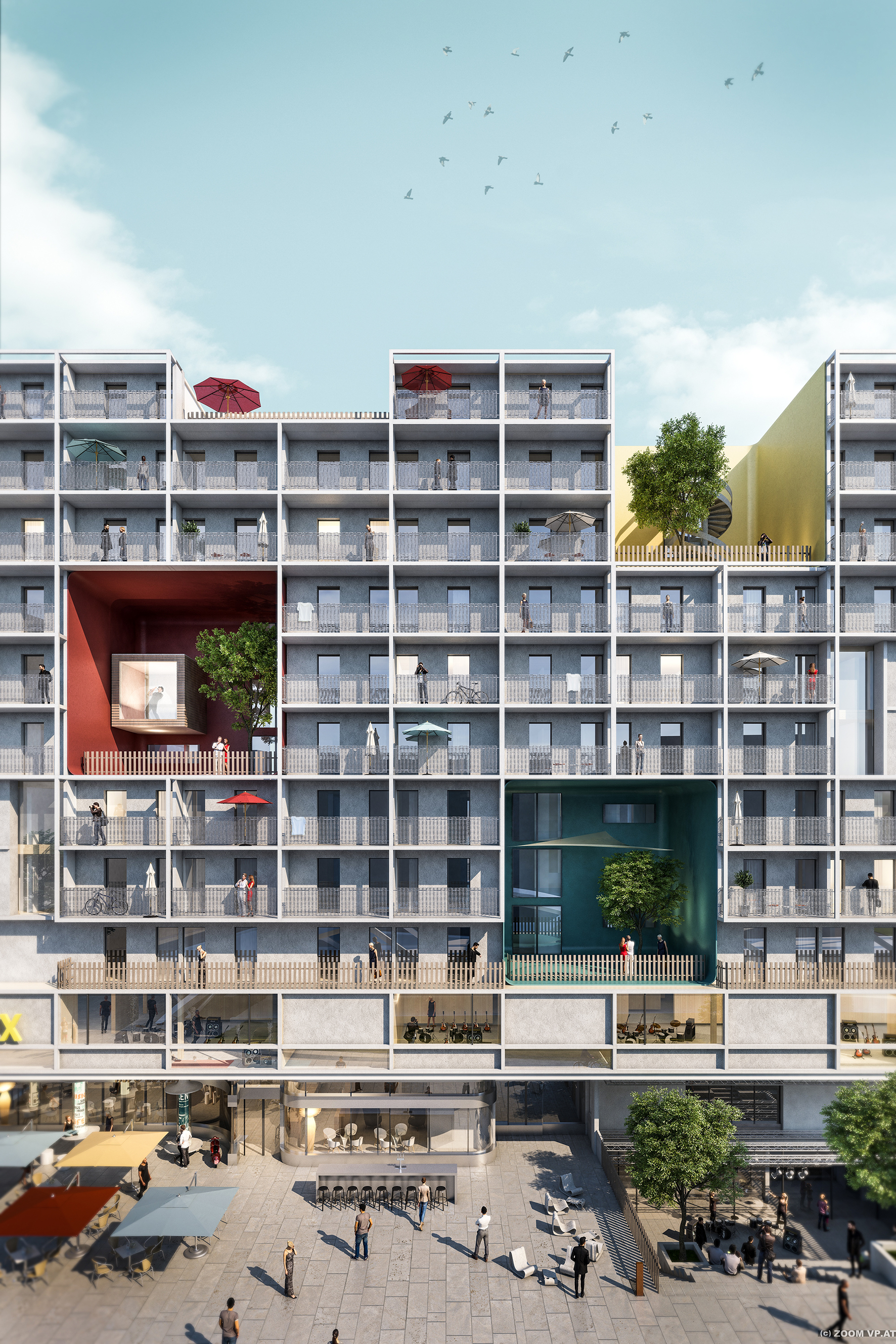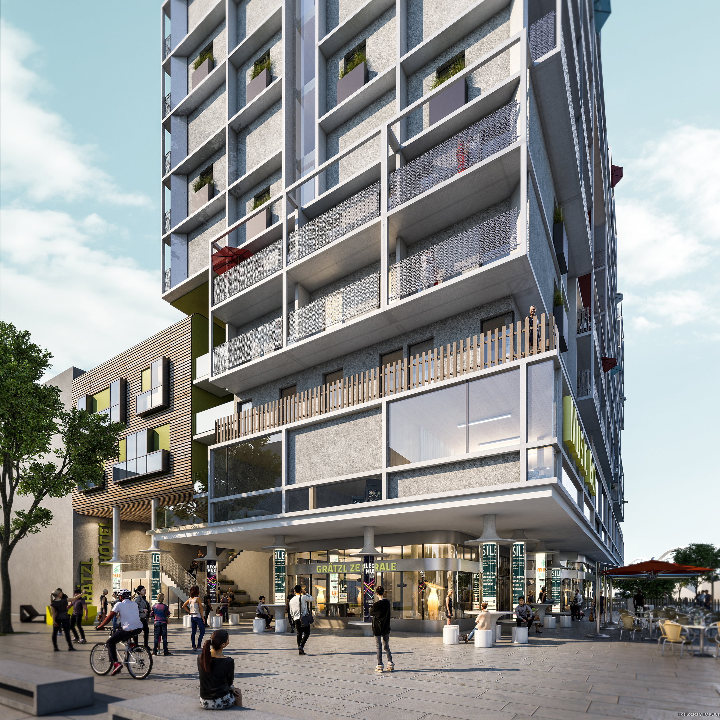 In der multifunktional erlebbaren Sockelzone liegt dem Nutzungskonzept die Schaffung von Bewegungs-, Kultur-, Service- und Informationsangeboten sowie von Flächen für die 2 Kleingastronomie zu Grunde. Im schallentkoppelten Untergeschoß werden Flächen für den Verein beatboxx realisiert, in welchem sich entsprechende Proberäume, eine Musikschule sowie ein Instrumentenverleih befinden werden. Vom ersten bis dritten Obergeschoß werden zirka 65 großzügige Hotelzimmer (Short-Stay) angeboten, vom vierten bis elften Stockwerk werden rund 120 Serviced Apartments von room4rent (Temporäres Wohnen) zur Verfügung stehen. Das dazugehörige Freiraum-Konzept legt besonderes Augenmerk auf die angrenzenden hochwertigen Freiräume. Es soll den fließenden Übergang zwischen Innen- und Außenraum ermöglichen.