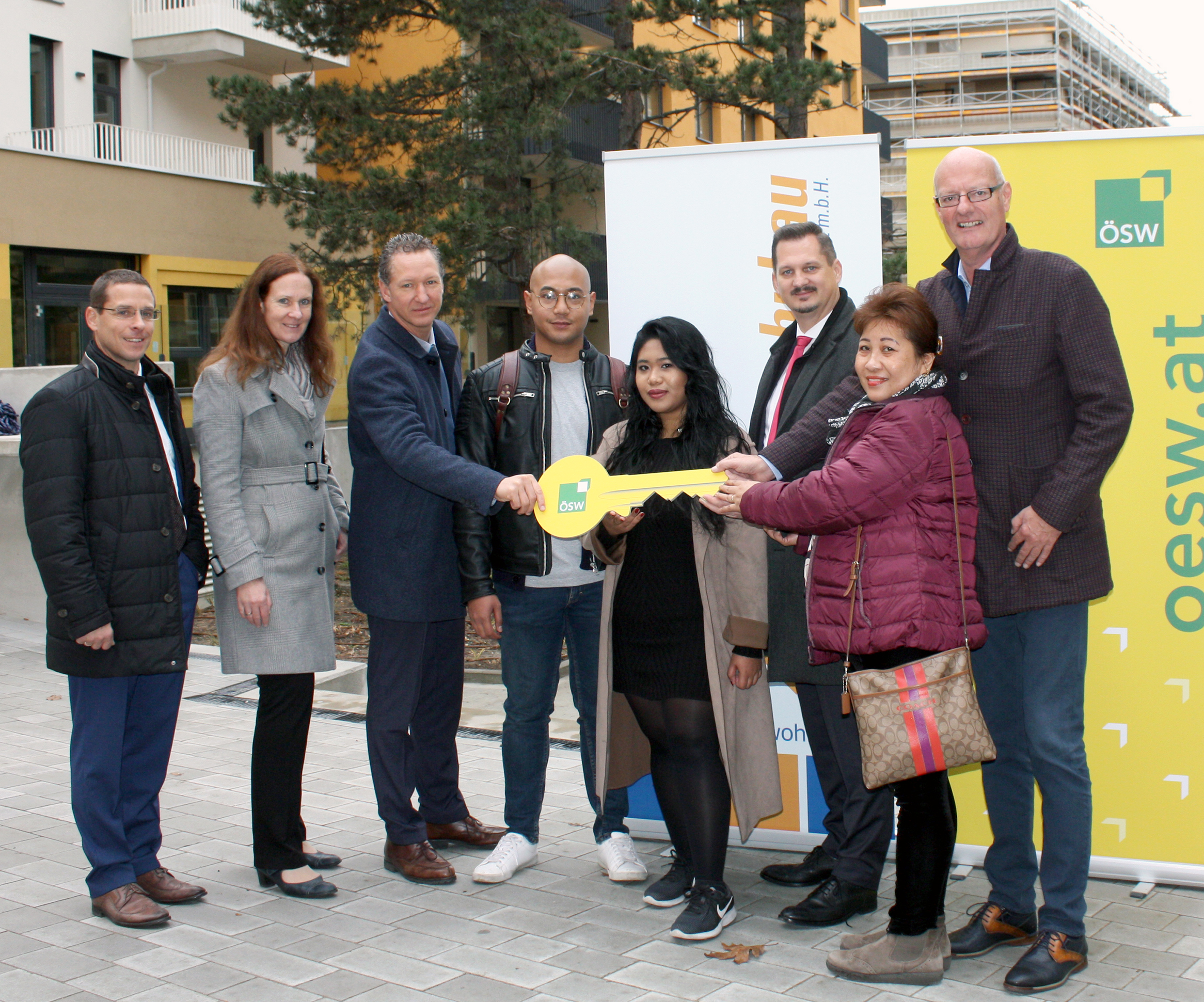 Nach der Gleichenfeier vor fast genau einem Jahr wurden nun die Wohnungen termingerecht an die Mieter übergeben. Neben ÖSW-Vorstand Wolfgang Wahlmüller und Mag. Bernhard Raffelsberger, Geschäftsführer der Familienwohnbau, begrüßte auch Marcus Franz, Bezirksvorsteher von Favoriten, persönlich die neuen Bewohner. Im Anschluss segnete Pater Hans Ettl das neue Wohngebäude.