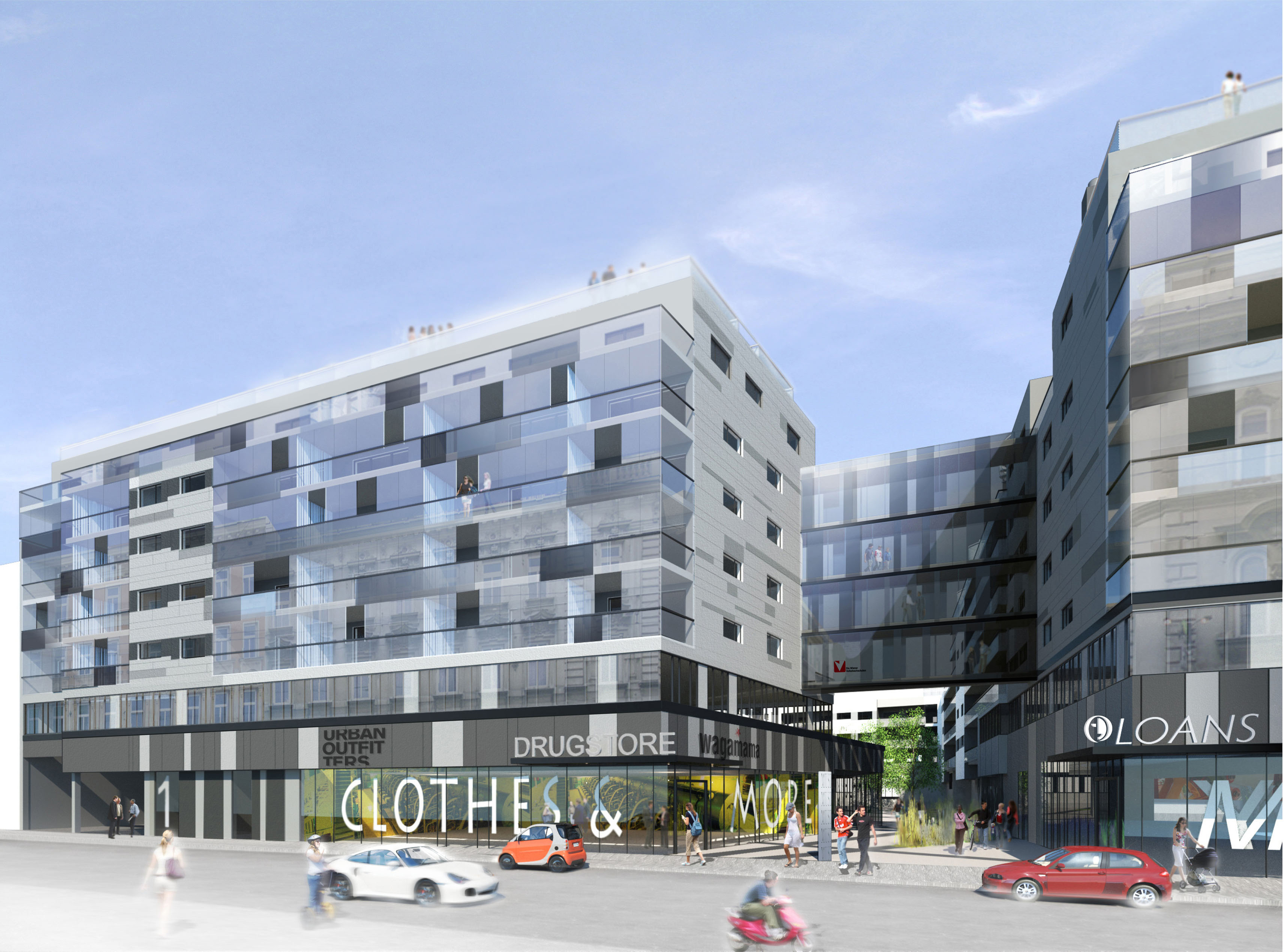 Durch ein vielfältiges Angebot an unterschiedlich nutzbaren Freiflächen mit unterschiedlichem Grad an Öffentlichkeit werden verschiedenste Möglichkeiten zur Kommunikation zwischen den Bewohnern und Nachbarn geboten. Die Gemeinschaftsräume sind mit jeweils ca. 100 m² für unterschiedliche Nutzungen geeignet. Die direkt vorgelagerten Grünräume können ebenfalls entsprechend mitbenutzt werden. Im Einzelnen gliedern sich die Gemeinschaftsräume wie folgt: Im Erdgeschoss befindet sich ein großzügig dimensionierter Kinderspielraum mit anschließender Waschküche sowie einer direkten Sichtverbindung auf die Spielplätze. Die Hausbetreuungszentrale ist ebenso im direkten Umfeld situiert. Zusätzlich zu den großzügig dimensionierten Fahrradund Kinderwagenabstellräumen wird in zentraler Lage auch eine Fahrradwerkstatt eingerichtet, die allen Bewohnern unentgeltlich zur Verfügung steht. Im 1. Obergeschoss befindet sich ein weiterer großzügiger Gemeinschaftsraum mit zusätzlichem direkt angeschlossenen Kleinkinderspielplatz und weitläufiger Gemeinschaftsterrasse. Der Gemeinschaftsraum wird zur Nutzung für wechselnde Veranstaltungen mit Küche- und Bar ausgestattet. Zusätzlich bereichert wird das Gemeinschaftsangebot durch eine Sauna im 4. Stock mit Ruheraum- und terrasse sowie einer ausgedehnten Freifläche. Eine zusätzliche Waschküche ist hier im direkten Anschluss vorhanden.