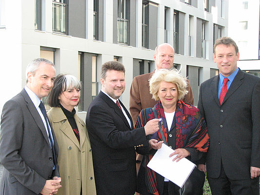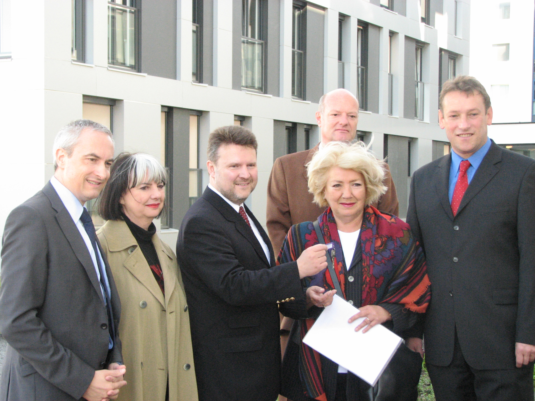 Wien - Am Mittwoch, den 7. Mai 2008, hat der Wiener Wohnbaustadtrat Michael Ludwig das Projekt des Österreichischen Siedlungswerks (ÖSW) in der Attemsgasse 5 besichtigt. Gemeinsam mit Bezirksvorsteher Norbert Scheed sowie den ÖSW-Vorständen Michael Pech und Wolfgang Wahlmüller konnte sich der Stadtrat im Rahmen einer Begehung vor Ort ein Bild von der kürzlich fertig gestellten Wohnanlage machen. Ende April hat das ÖSW das von der ARGE Elsa Prochazka Architekturbüro und Baumschlager Eberle P.ARC ZT GmbH geplante Projekt in der Attemsgasse übergeben. Stadtrat Ludwig überreichte heute der Mieterin Christine Koller symbolisch den Wohnungsschlüssel. Diese zeigte sich begeistert über ihre neue Wohnung und betonte: "Vom ersten Kontakt mit dem ÖSW bis zur Übergabe ist alles sehr zufriedenstellend verlaufen. Die Mitarbeiter von Vertrieb, Hausverwaltung sowie Technik waren um meine Anliegen stets sehr bemüht und haben alles rasch und lösungsorientiert abgewickelt."