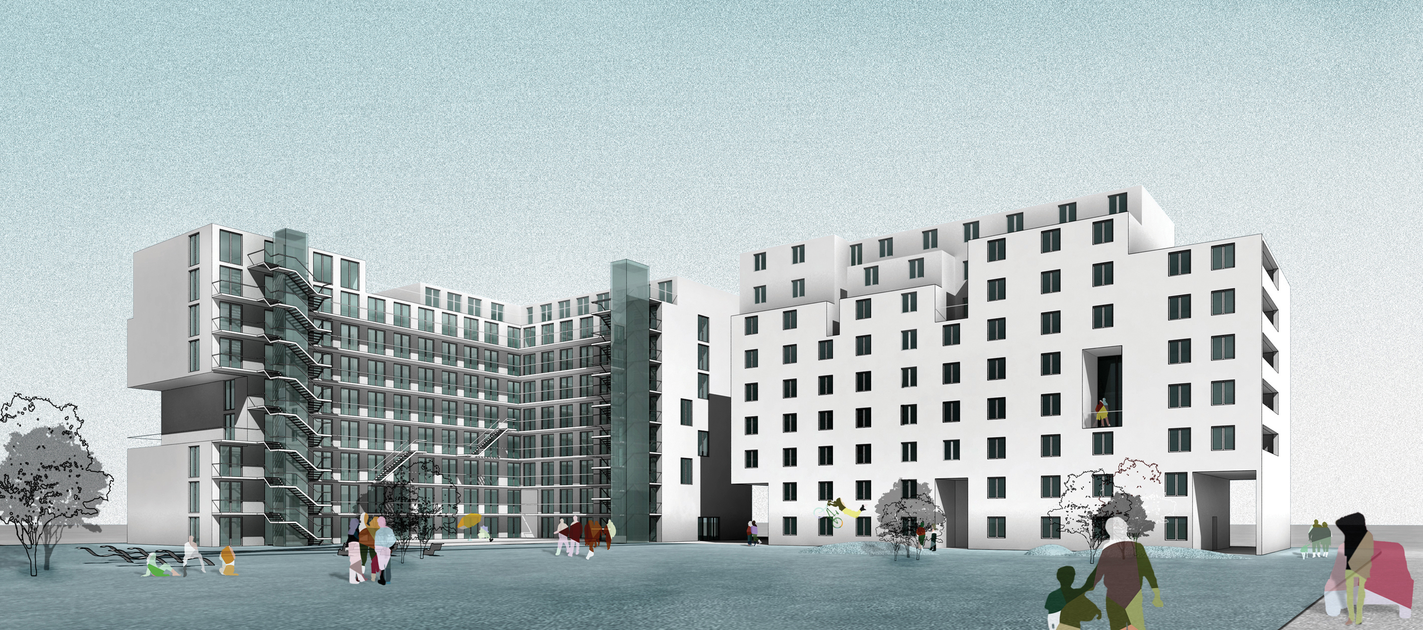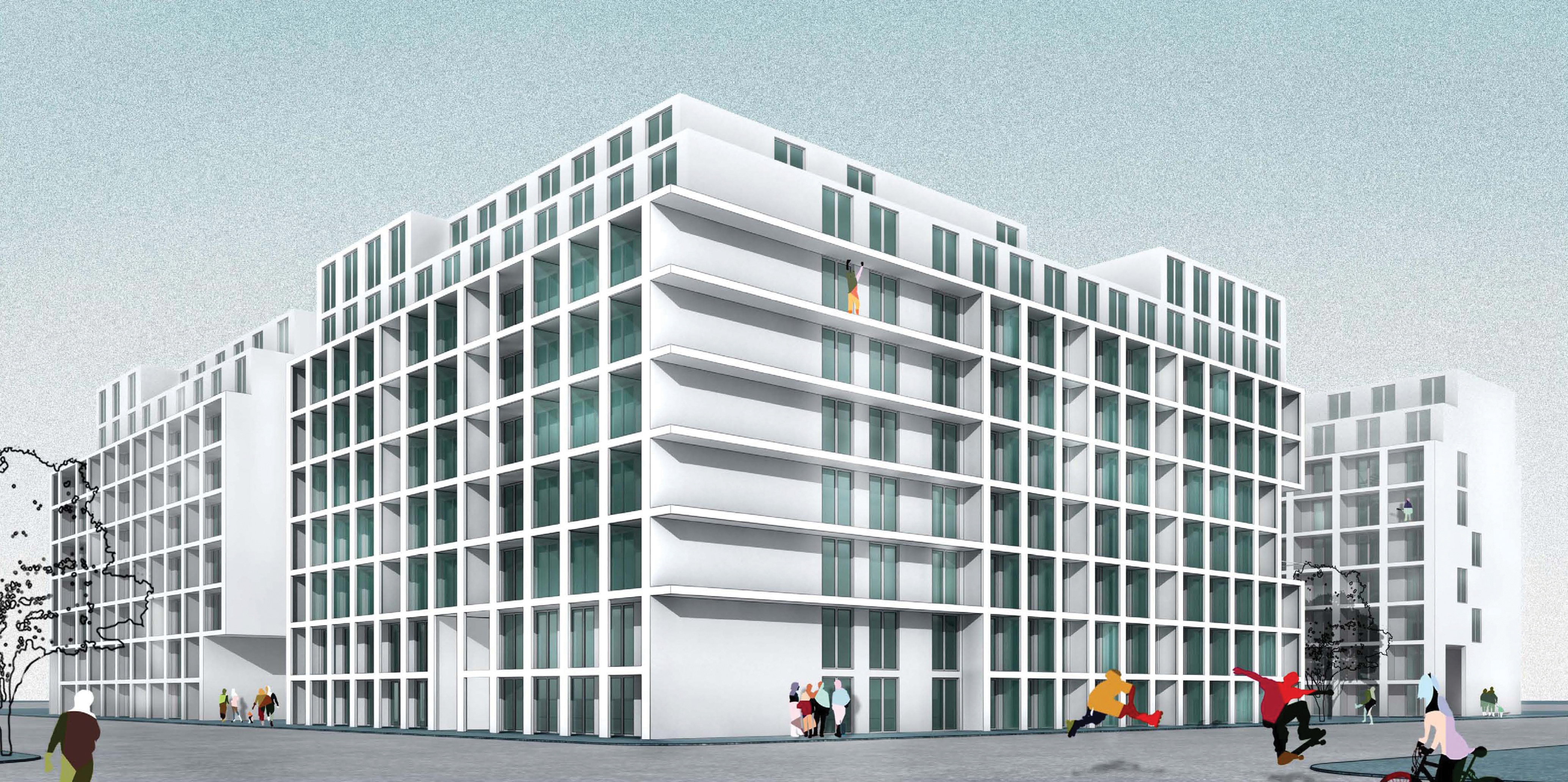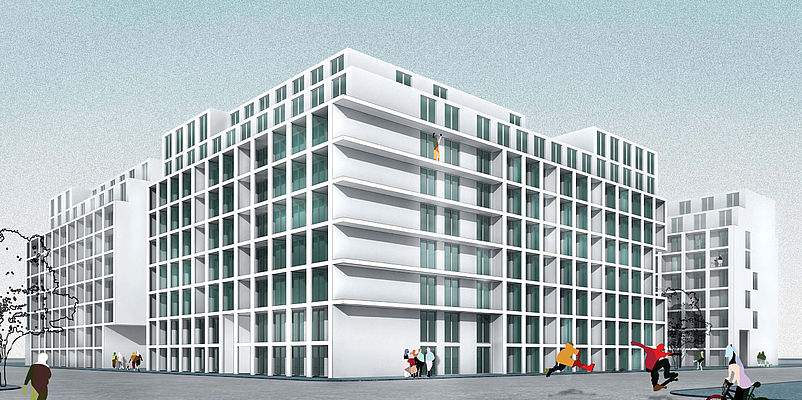 Das ÖSW überzeugte die hochkarätig besetzte Jury mit einem Projekt, das den Ansprüchen unterschiedlicher Zielgruppen gerecht wird. Bei dem Projekt handelt es sich um eine Blockrandbebauung mit einem L-förmigen und zwei rechteckigen Baukörpern, die in direkter Beziehung zueinander stehen. Im Gebäude "Junge Wohngemeinschaft" werden einerseits junge Menschen angesprochen, die das erste Mal das elterliche Nest verlassen, sei es, um ins Berufsleben einzusteigen, eine Lehre, ein Studium oder eine sonstige Ausbildung zu beginnen und daher auf eine besonders kostengünstige Wohnform angewiesen sind. In den WGs wohnt man eigenmittelfrei. Es werden 42 WGs unterschiedlicher Größen errichtet, die mit zwei Aufzügen, wovon einer fahrradtransporttauglich dimensioniert ist, über offene Laubengänge erschlossen werden. Geplant sind gemeinsame großzügige Wohnküchen, die die Gemeinschaft fördern, sowie gemeinsame Sanitärräume. Rückzugsmöglichkeiten finden die zukünftigen Bewohner in ihren privaten Zimmern mit vorgelagerten Loggien. In den "Apartmenthäusern" finden sich klassische 2-, 3- oder 4-Zimmer Wohnungen, die durch betonte Simplizität bestechen. Der erforderliche geringe Eigenmitteleinsatz bietet in diesem Projekt Jungfamilien die ideale Voraussetzung für kostengünstiges Wohnen. Die flexibel gestaltbaren Geschosswohnungen sind klassisch oder als Loft nutzbar.