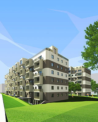 Das Projekt mit einer Wohnnutzfläche von rund 10.000 m² umfasst 110 geförderte Mietwohnungen mit Eigentumsoption. Die Wohnungsgrößen variieren zwischen 60 und 106 m². Die Geschosswohnungen zeichnen sich durch flexible Mitgestaltungsmöglichkeiten und großzügig dimensionierte Wohnküchen mit davorliegenden Freiräumen wie Loggien, Balkonen und Terrassen aus. Alle Wohneinheiten werden durch natürlich belichtete Stiegenhäuser erschlossen. Die Querdurchlüftung jeder Wohnung sichert einen hohen Wohnkomfort. Die beiden parallel situierten Baukörper entlang der Straße und entlang des im Süden gelegenen Parks werden durch einen großzügigen Grünraum verbunden. Diesen durchzieht ein leicht terrassierter Hügelzug, der mit seinen lockeren Baumpflanzungen Distanz zwischen den Baukörpern schafft und den Erdgeschoss-Wohnungen eine gewisse Intimität sichert.