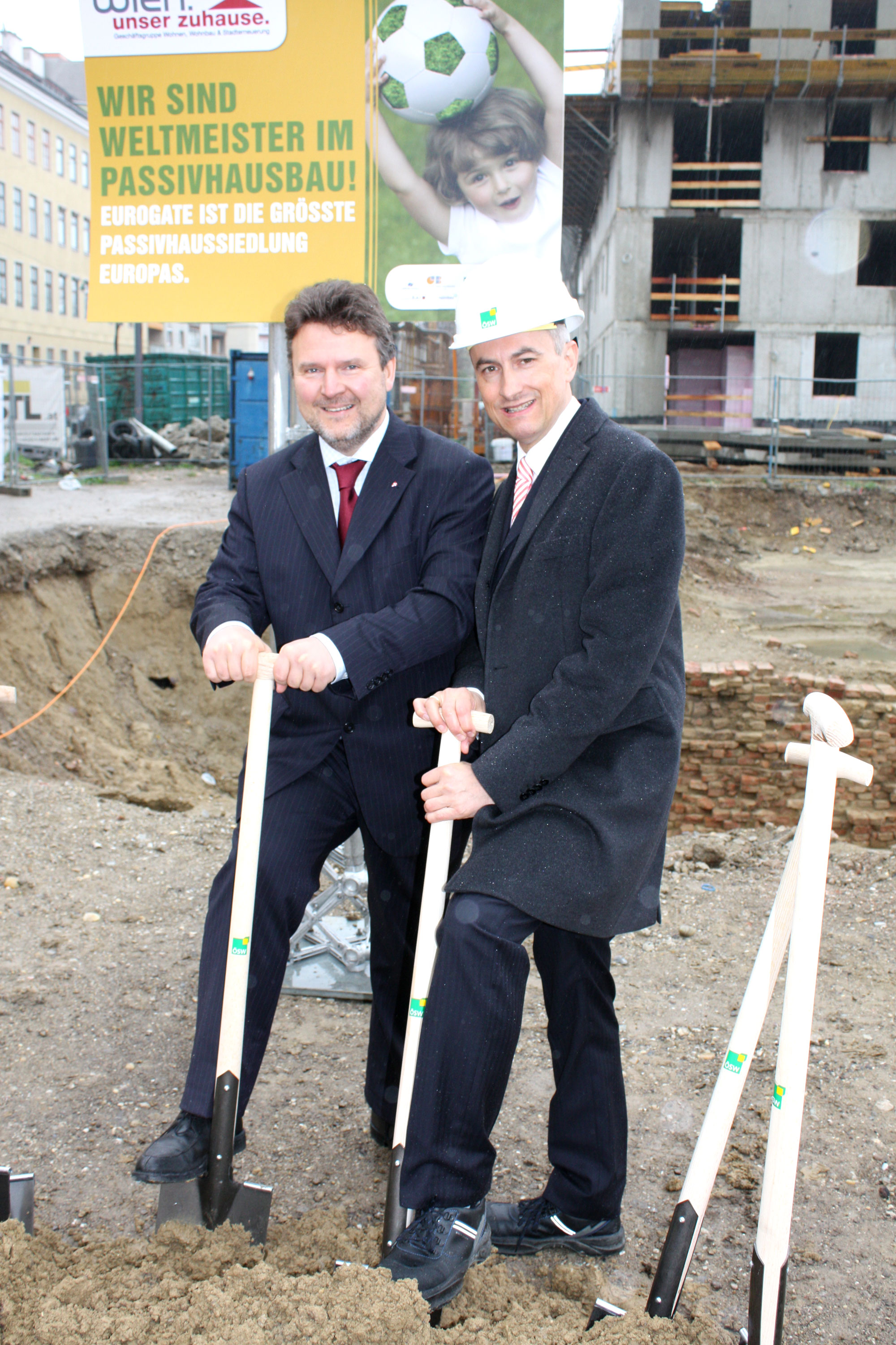 „Eurogate“ wurde das einzigartige Projekt in der Aspangstraße getauft, mit dem die Stadt Wien ihre führende Position im Passivhausbau weiter ausbauen kann. Beim feierlichen Spatenstich auf dem Bauplatz des Österreichischen Siedlungswerkes durften auch Wohnbaustadtrat Vizebürgermeister Dr. Michael Ludwig und Dipl.-Ing. Michael Pech, Vorstand ÖSW AG, nicht fehlen. "Mit der Umsetzung des Passivkomforthauses soll ein wesentlicher Beitrag zur Akzeptanz des Passivhausstandards im mehrgeschossigen Wohnbau geleistet werden. Das ÖSW stellt mit diesem Projekt einmal mehr seine ökologische Verantwortung unter Beweis.", freute sich ÖSW-Vorstand Michael Pech beim Spatenstich.