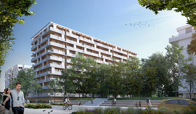 Unter dem gemeinsamen Titel „THEOs – Willkommen im Park“ errichtet die ÖSW-Gruppe auf drei von sieben Bauplätzen insgesamt rund 470 Wohnungen mit einem differenzierten Wohnungsmix aus geförderten und freifinanzierten Mietwohnungen sowie freifinanzierten Eigentumswohnungen.