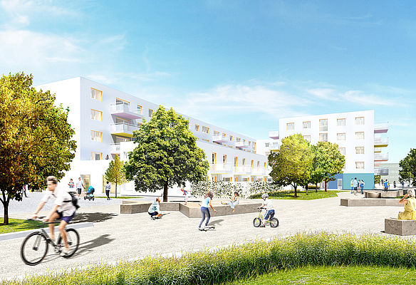 Die Berücksichtigung ökologischer wie soziokultureller Gesichtspunkte stand im Fokus des 2017 abgeschlossenen einstufigen Bauträgerwettbewerbes für das Stadtgebiet im 23. Wiener Gemeindebezirk. Das hohe Entwicklungspotential des 6 ha großen ehemaligen Gewerbe- und Industriegebietes wurde optimal ausgeschöpft, um qualitätvollen und leistbaren Wohn- und Lebensraum zu schaffen: In dem neuen Wohnquartier entstehen bis 2020 insgesamt mehr als 1.350 Wohnungen. Neben den (super-)geförderten und freifinanzierten Projekten mehrerer Bauträger wird die lokale Infrastruktur laufend erweitert. Das bauplatzübergreifende Konzept einer kleinteiligen Bebauungsstruktur in Kombination mit großzügig angelegten Grünflächen wie dem „Platzpark“ lässt ein attraktives Quartier mit hoher Lebensqualität entstehen.