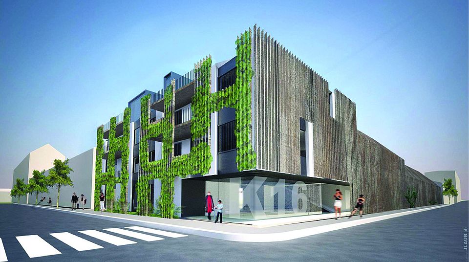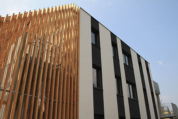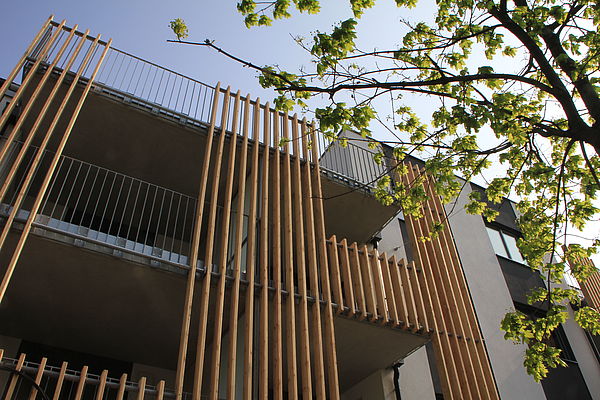 In Anlehnung an das Umfeld haben die Architekturbüros Josef Weichenberger Architects und Room8 Architects ein modernes Gebäude entwickelt, das sich in zwei Bereiche gliedert. Das äußere Erscheinungsbild der Anlage wird durch die mit vertikalen Lärchenholzlamellen gestalteten Laubengänge entlang der Leo-Mathausergasse bzw. die Holzlamellenfassade entlang der Ketzergasse – diese kann auch als Rankgitter für Kletterpflanzen verwendet werden – geprägt.