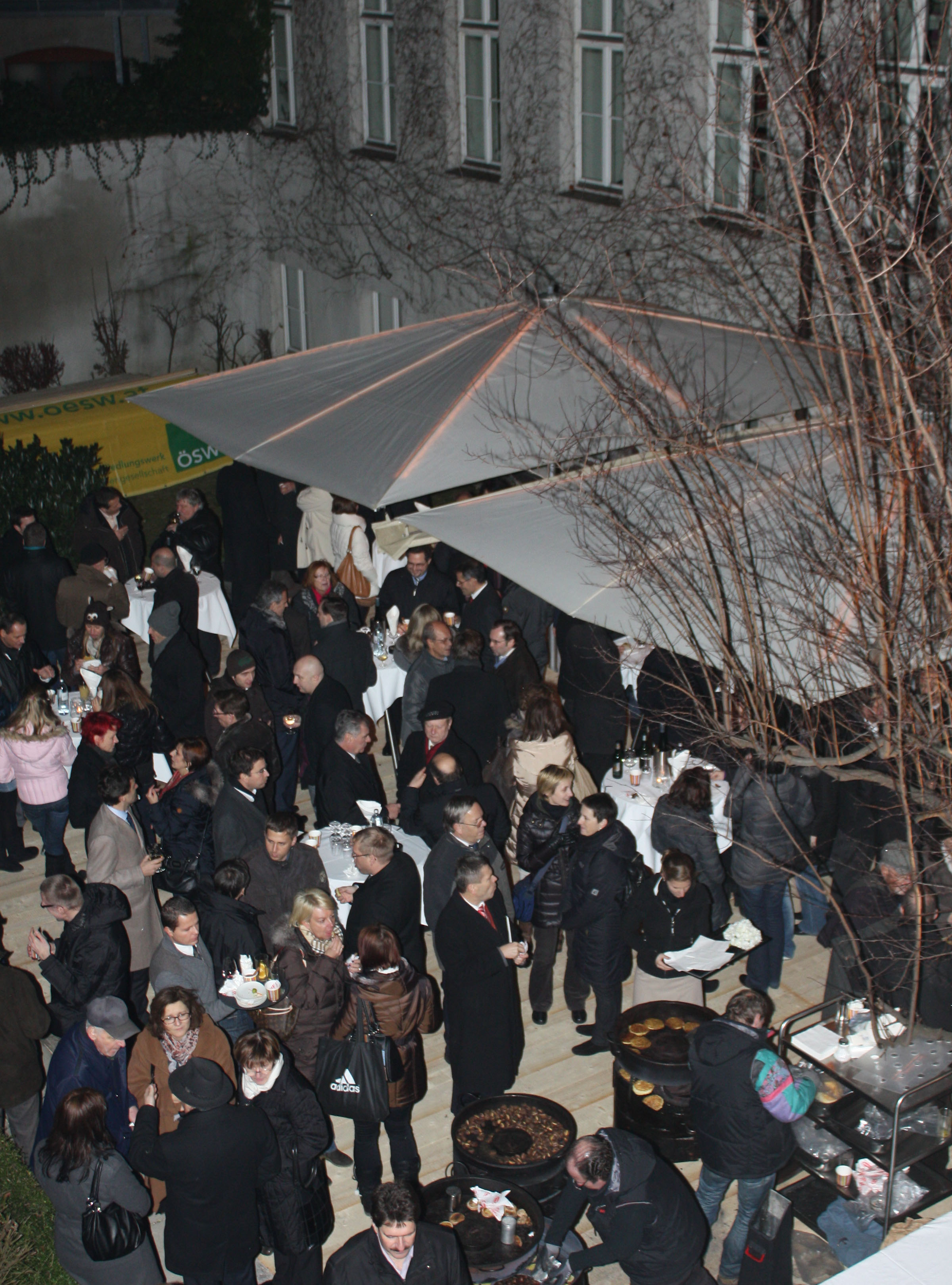 Bei Punsch, Wintersnacks und schönem Winterwetter feierte das ÖSW mit rund 400 Gästen den traditionellen NeujahrspunschAm Mittwoch, 11. Jänner 2012, luden die Vorstände des Österreichischen Siedlungswerks, Michael Pech und Wolfgang Wahlmüller, zum traditionellen Neujahrspunsch in den Innenhof des ÖSW-Firmensitzes im 8. Bezirk. Rund 400 Gäste aus Bauwirtschaft, Finanz, Architektur und Politik waren der Einladung gefolgt und nahmen die Gelegenheit zum Kennenlernen, gegenseitigen Austausch und Networken am Jahresanfang wahr. Michael Pech und Wolfgang Wahlmüller freuten sich sehr, dass sich der Neujahrspunsch bereits so etabliert hat und eine Vielzahl an Gästen gekommen ist um gemeinsam auf das neue Jahr anzustoßen.Für das leibliche Wohl sorgten Punsch und Glühwein sowie „Maronibräter“-Delikatessen und andere Snacks. Im gemütlichen Innenhof und im Kellergewölbe des ÖSW herrschte eine entspannte Atmosphäre – ein Garant dafür, dass die ÖSW Neujahrspunschtradition wieder für einen guten Start ins neue Arbeitsjahr gesorgt hat. Die ÖSW AG steht an der Spitze der ÖSW-Firmengruppe, die über mehr als 25 Beteiligungen verfügt und ca. 50.000 Einheiten verwaltet. Damit ist der Konzern der größte private gemeinnützige Bauträger in Österreich. Neben dem Wiener Markt ist das Österreichische Siedlungswerk schwerpunktmäßig in Niederösterreich, Salzburg und Kärnten tätig.