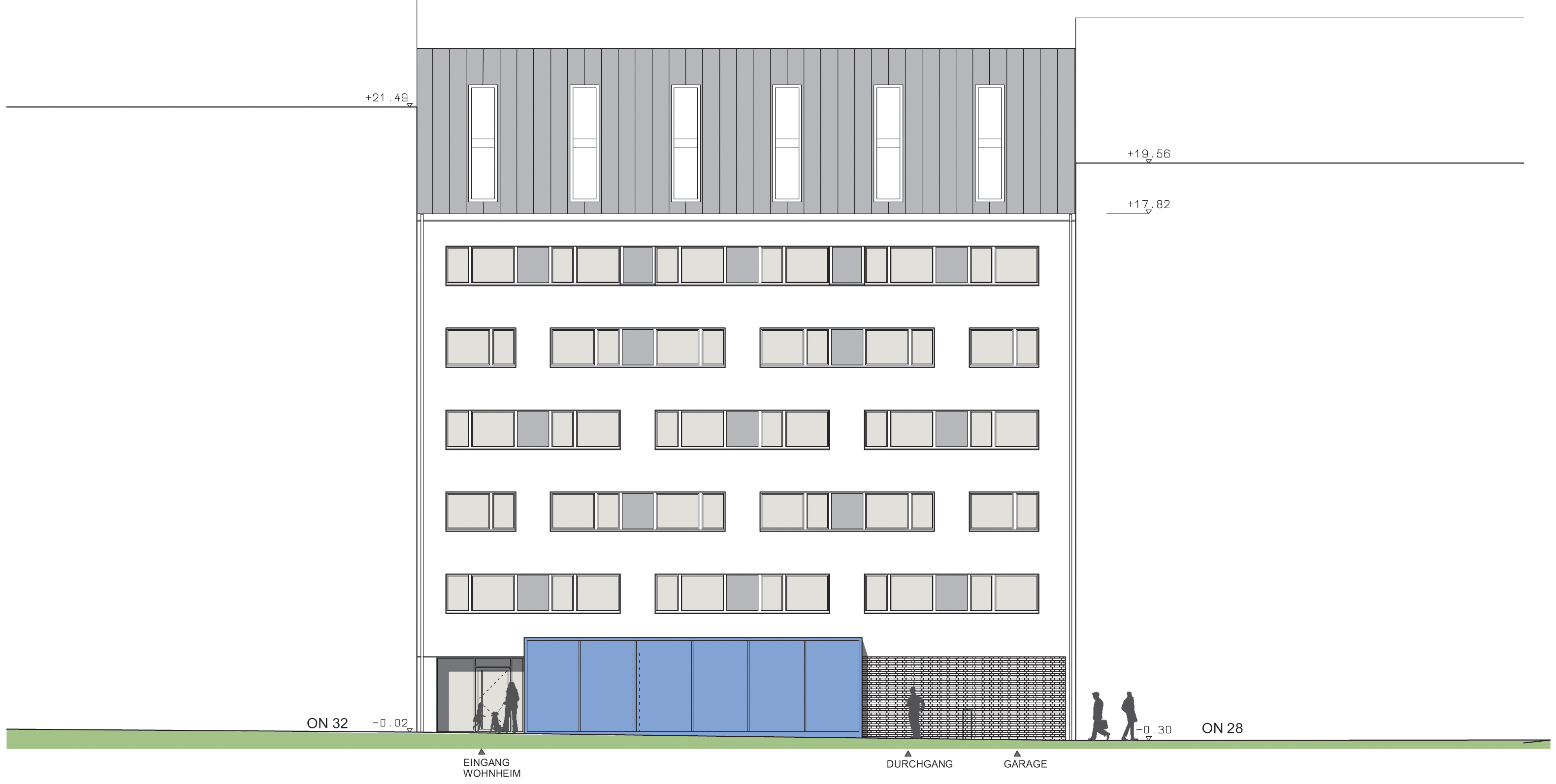 In dem Projekt gibt es überwiegend Einzelzimmer inklusive Küchenblock, Bad und WC sowie Wohneinheiten, bei denen jeder Bewohner über ein eigenes Zimmer verfügt und die Nebenräume wie Bad, WC und Küche mit anderen geteilt werden. Das Gebäude wird durch ein zentral gelegenes Stiegenhaus samt behindertengerechten Aufzug erschlossen. Die allgemein genutzte Erdgeschosszone ist transparent und offen, die Einheiten in den Obergeschossen sind geschlossen strukturiert. Die großzügig gestalteten Gemeinschaftszonen sollen die Kommunikation unter den Bewohnern fördern. Als Gemeinschaftsbereiche sind eine Gemeinschaftsterrasse, ein Gemeinschaftsgarten sowie im Untergeschoss ein natürlich belichteter Fitnessraum geplant.