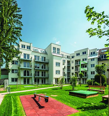 Kompakte und durchdachte Grundrisse mit Wohnungsgrößen zwischen 44 und 115 m² bieten sowohl Singles als auch Familien eine komfortable Wohnlösung für individuelle Bedürfnisse. Das vollwärmegeschützte Niedrigenergiehaus wurde qualitativ hochwertig ausgestattet: Wohnräume mit Parkettboden bzw. Sanitärräume mit Feinsteinzeug und Badewanne. Der Außenbereich der 1- bis 4-Zimmer-Wohnungen wird durch die großzügig gestalteten privaten Freibereiche optimal ergänzt. Loggien mit bis zu 11 m², kleinere Balkone und Terrassen mit bis zu 13 m² bzw. 10 bis 46 m² große Eigengärten erweitern den Wohnraum ins Freie. Der Kleinkinderspielplatz im Innenhof, ein Kinderwagen- und Fahrradabstellraum sowie eine Waschküche im Erdgeschoß und eine Tiefgarage runden das Projekt optimal ab. Die modern ausgestatteten Wohnungen weisen einen geringen Bruttomietpreis von rund € 9,90/m² und einen Finanzierungsbeitrag von ca. € 500,-/m² auf, wodurch sie nahezu an die Konditionen von geförderten Wohnungen anknüpfen können.